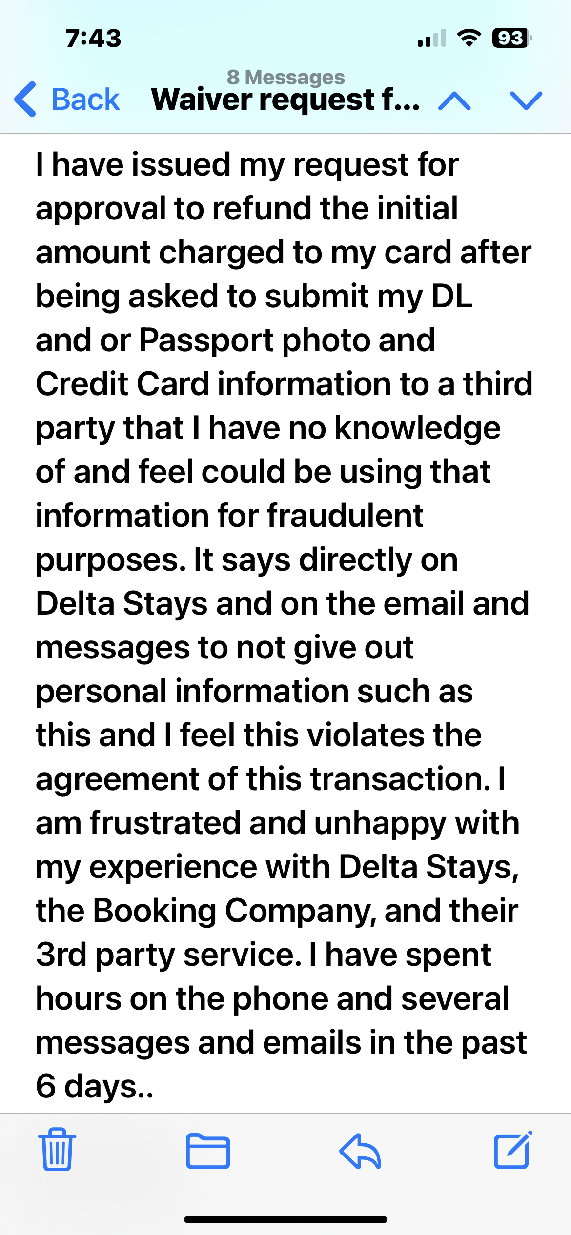 I booked an overnight stay in Seattle (12/21/24) through Delta stays. This was because I have been a longtime member of Delta and trusted booking through them. They have my card information and all travel related information stored. It was stated an id and deposit would be required but since both are in my account with Delta it was under my understanding they provide secure transmission of that. After confirming I started to receive emails (11/15/24) requesting I go to a Third Party Site to upload my passport and my card as ... read more