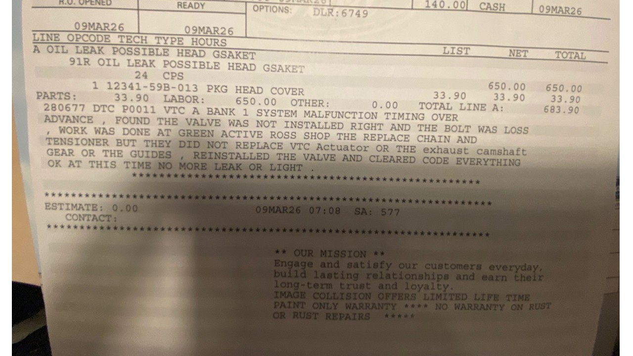No stars was not an option, so one star it is. I spent $3000 here on Friday March 6, 2026 to have the timing belt and other maintenance done on my Honda CRV. The next day, the low oil light came on. I had to pull over at the side of the road to check - indeed there was no oil measured using the dipstick. Luckily, I was a few hundred metres from a RONA, where I bought oil, and then a quick trip to the Honda dealership. Closed for the weekend, but today I learned that the timing belt had been installed incorrectly, so the oil ... read more