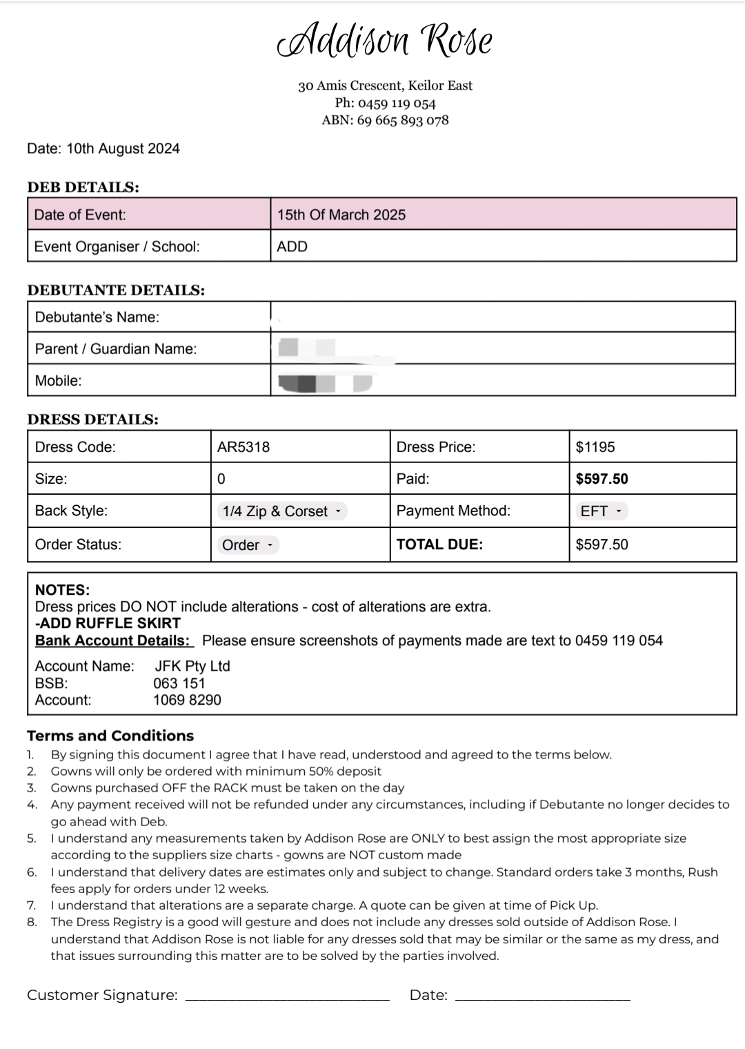 DO NOT SHOP HERE – ABSOLUTELY APPALLING SERVICE! If I could give zero stars, I would. My daughter purchased her Deb dress from Addison Rose on August 10, 2024, for a Debutante Ball scheduled on March 15, 2025—plenty of time, right? Wrong. As of February 22, 2025 (more than six months later and just three weeks before the event), the dress was still not available. This left absolutely no time for alterations or the dress rehearsal, causing unnecessary stress and frustration. To make matters worse, when my daughter rightfull... read more
