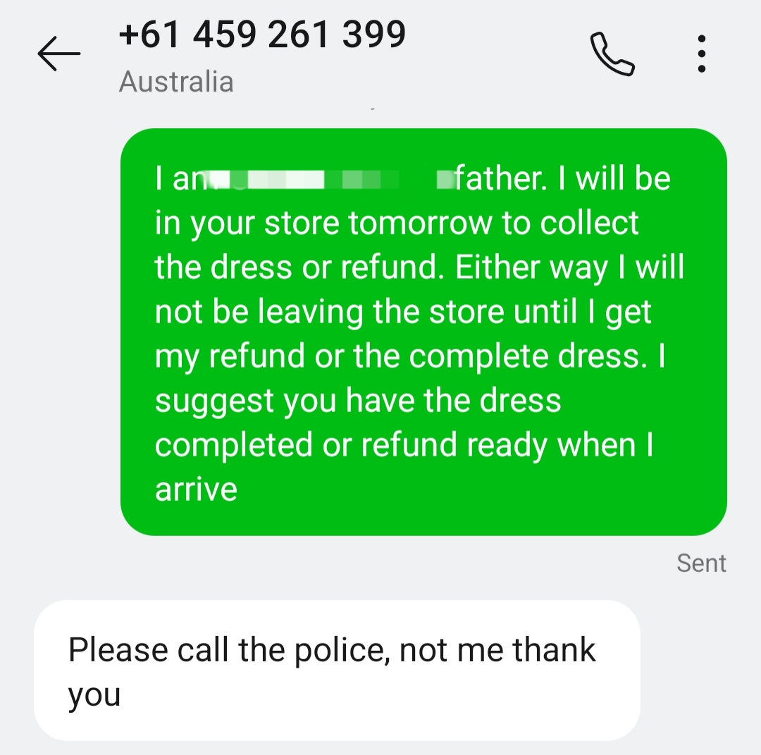 Worst customer service experience. Bullied into buying the dress on the day - paid the full amount up front. It was 9 months prior to the Deb. 2 months prior contacted the shop to enquire about delivery date. Was told it would be there 4 weeks from Deb date. Called 4 weeks before Deb. Phone not answered, messages and emails not responded to., dms not answered. Tried to blame supplier. Called supplier direct. It was not a supplier issue. Very stressful experience. Received the dress 12 days before Deb. WORST experience ever.... read more