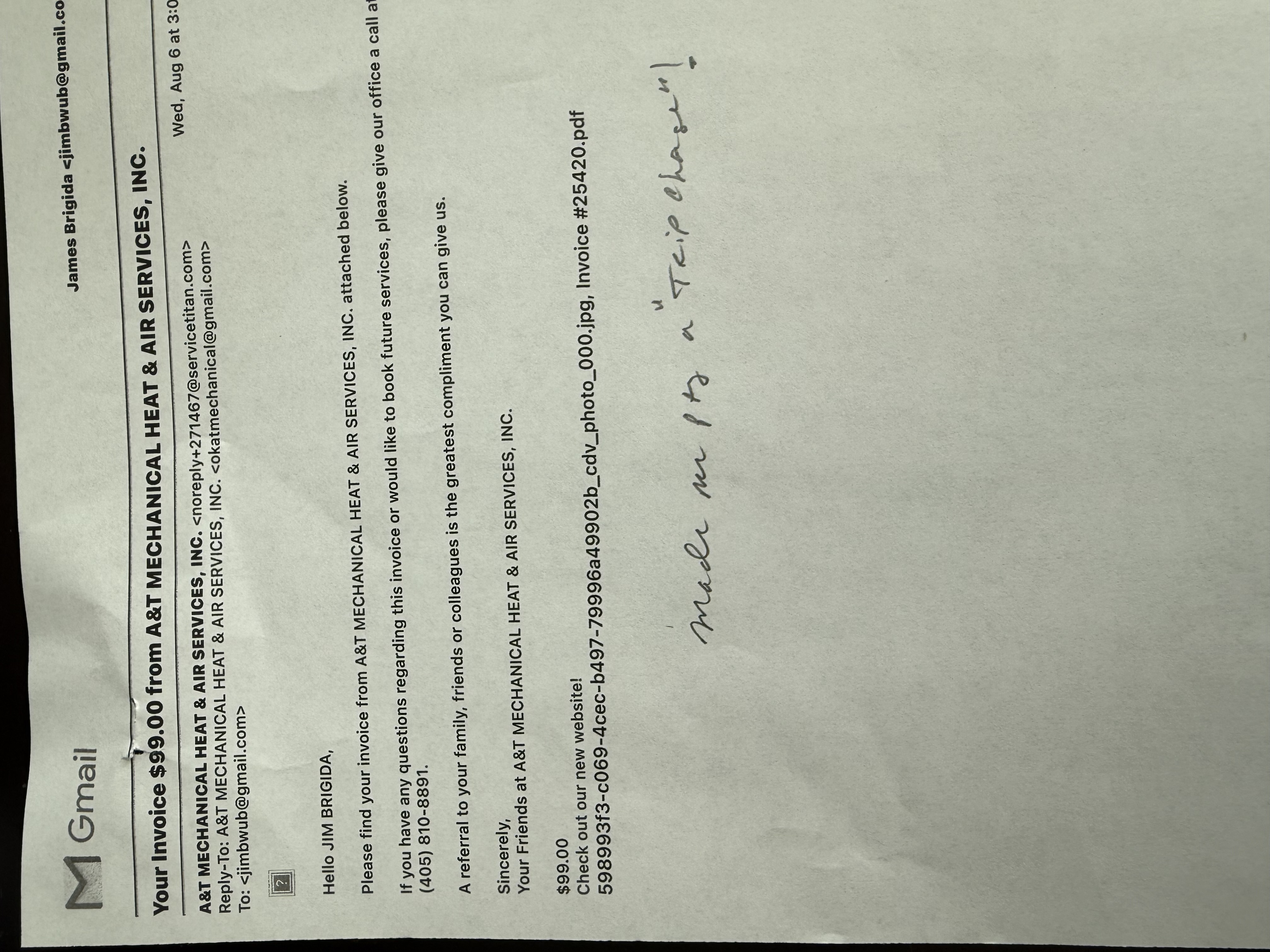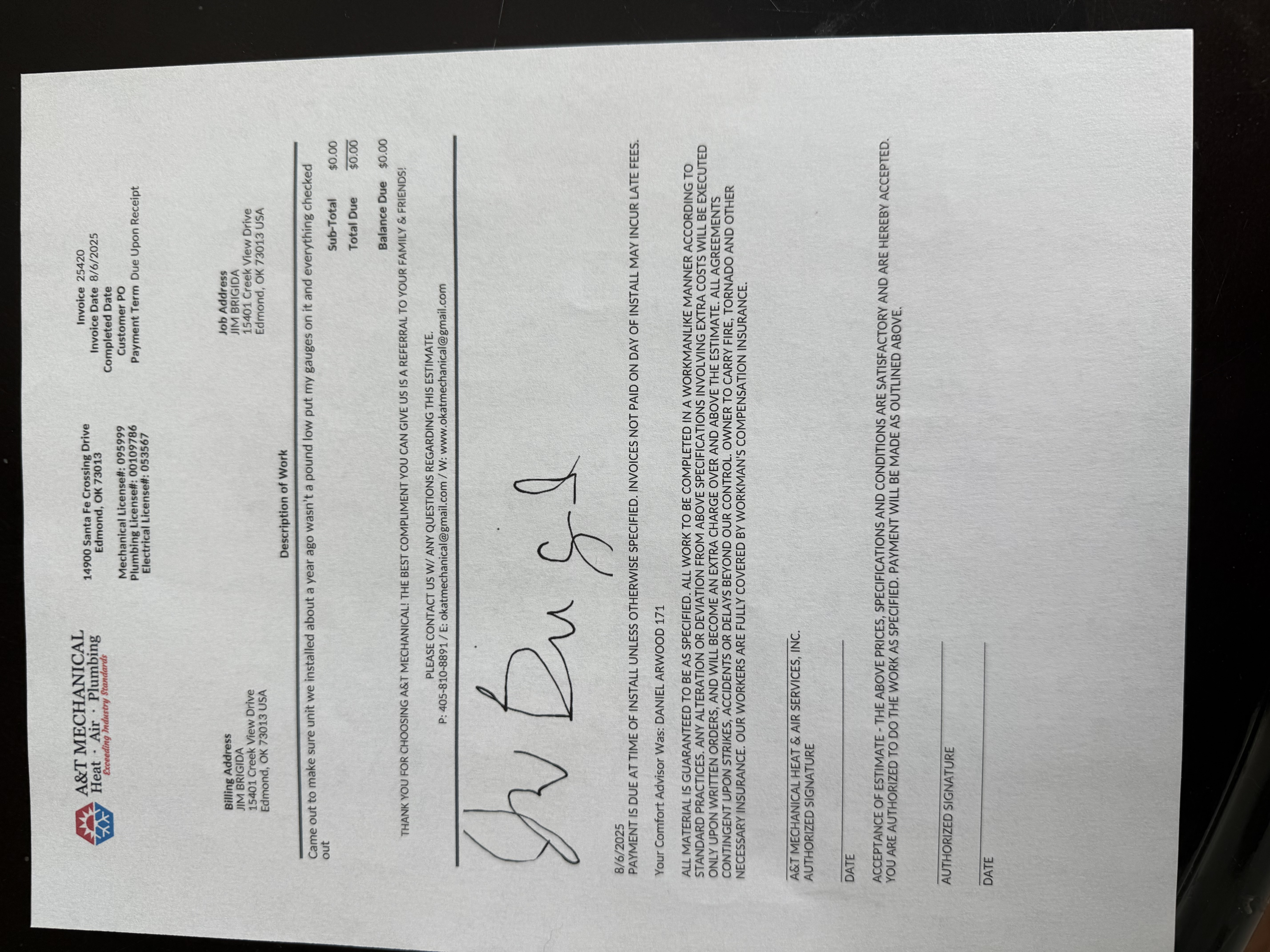 A&T Mechanical came out to check the Freon level in a system they sold us a little over a year ago. We were told by another company that it was one pound low on Freon. The A&T tech came out and checked it out and said the unit was fine . He gave me an invoice for “0”$ and went on his way . A few minutes later he called and said his company told him he had to come back and collect a $99 trip charge. In an effort to not put the tech between a rock and a hard place, I paid the charge. If I had known this company that sold the s... read more