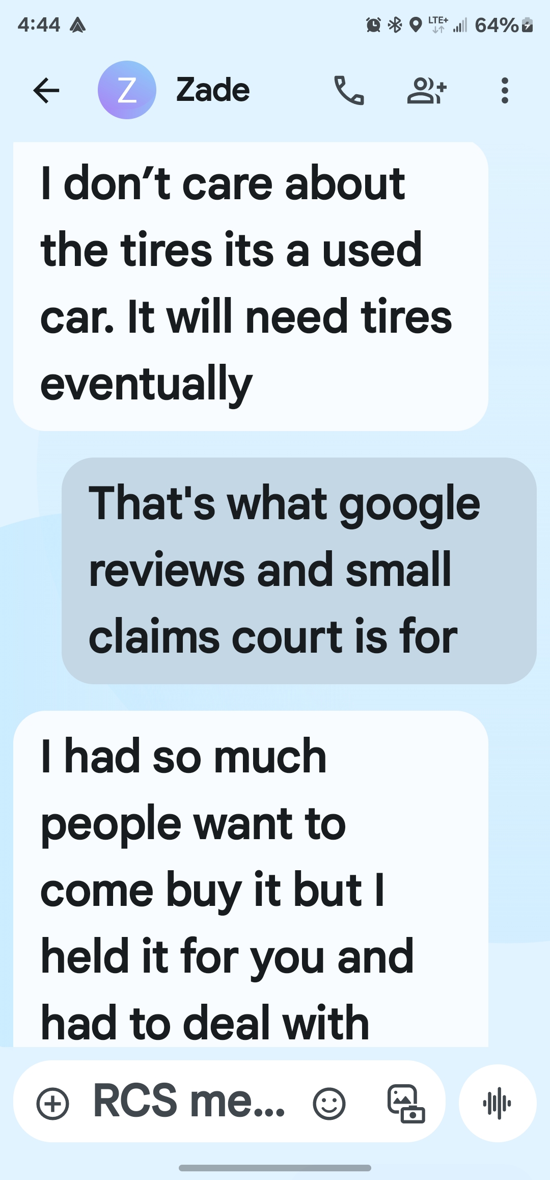 I wish I could leave a negative negative. Negative with no stars but I can't. Zaid was our salesperson one hundred and ten percent as dishonest as they come car ended up having bad tires on it that were overinflated to keep it from sounding bad. Front passenger side tire ended up having a split in it and blew less than 48 hours after getting the car. Messaged Zaid to ask for them to make it right and he informed me that he didn't care if the tires were bad. No concern whatsoever for the safety of his customers. Total pos and... read more
