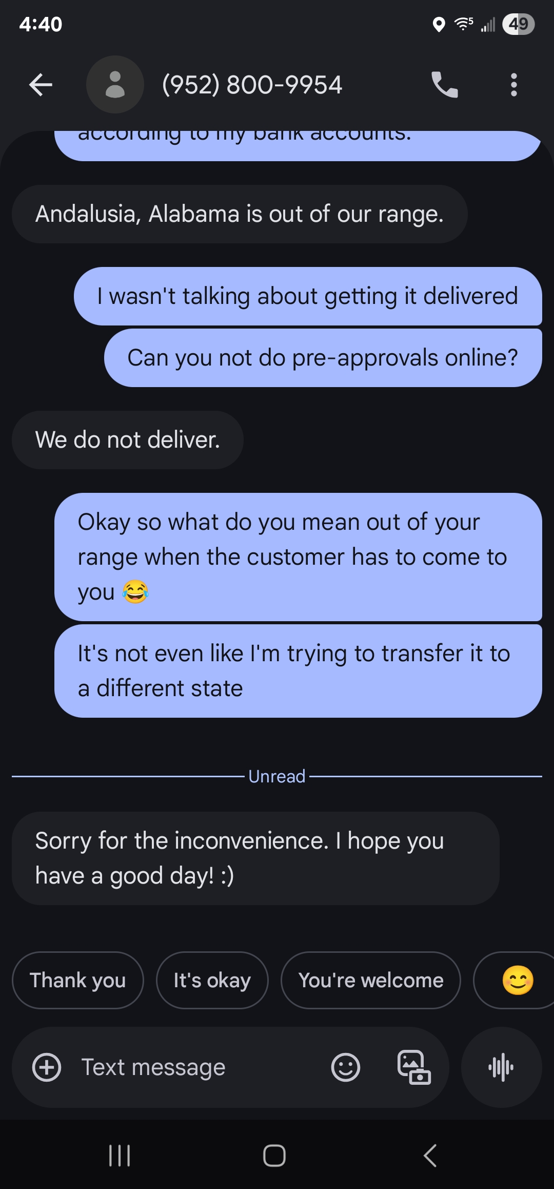 They told me they did not service my area even though I'm in the same state as them