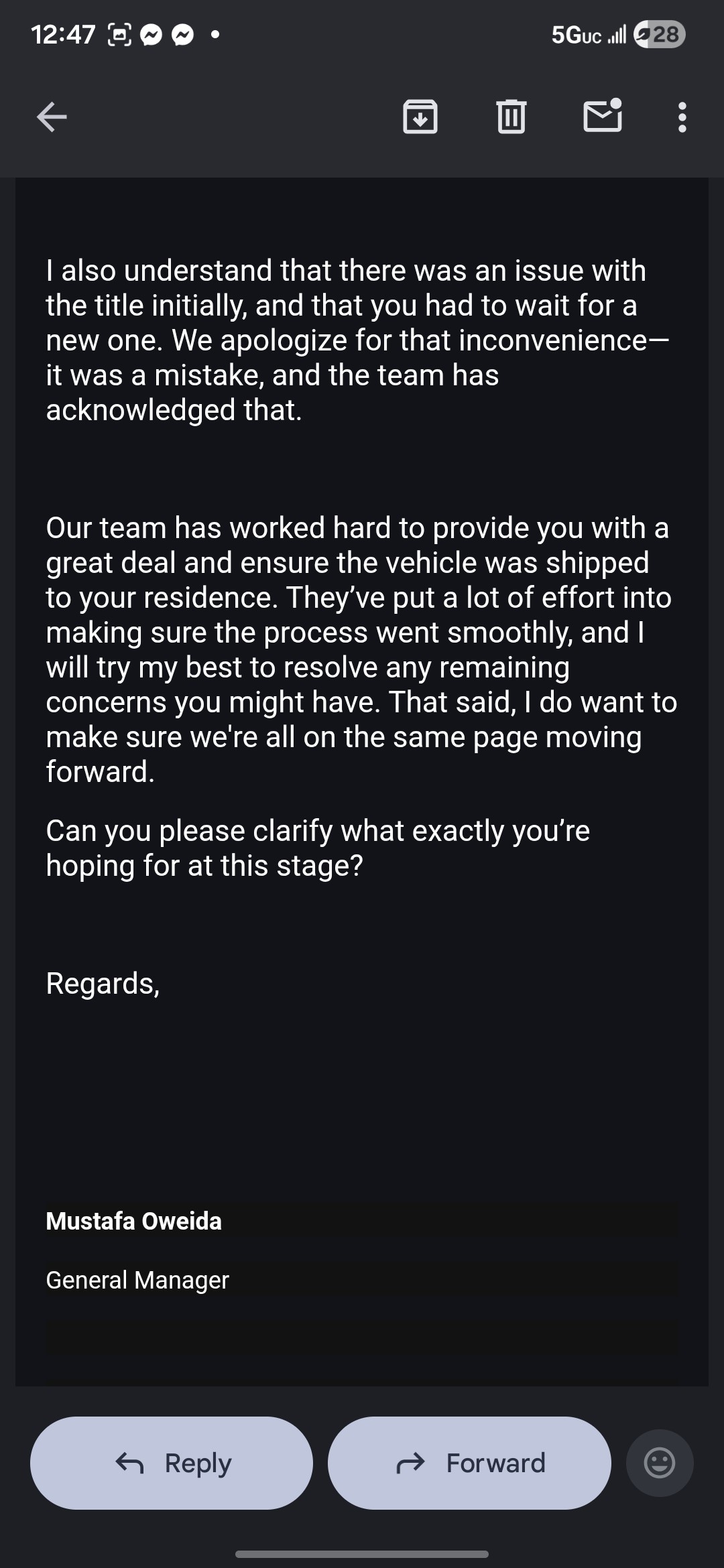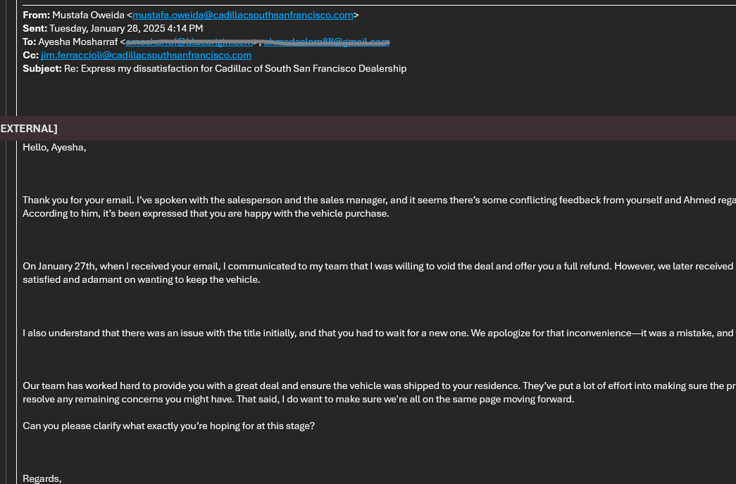 I purchased a vehicle from Cadillac of South San Francisco on December 30–31, 2024. In my experience, the purchase involved misrepresentation, undisclosed vehicle condition and safety defects, delayed delivery, improper handling of title/registration paperwork, unmet purchase commitments, financial loss, and failure to resolve after repeated escalation. Specifically: • The vehicle was scheduled to ship January 2 but arrived January 10, without a full gas tank or tracking information. • Title and registration paperwork was de... read more
