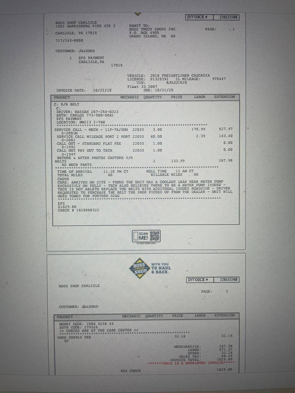 10/20/2025 at 17:43pm ordered the road service to change a belt on the engine (was given 60min ETA), 3 hours later called for update they said mechanic could not find our truck so he went to the store to buy a belt without checking and got into accident on his they back (hope he’s OK), so they sending another guy, new mechanic showed up around midnight and refused to change the belt because of some coolant leak (after spending another 1h at the spot) So they charge us 671.37$ for labor, 32.16$ for shop supply and 269.98$ f... read more