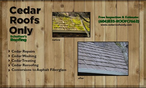 Cedar Roof Repairs, Washing, and treating. 35 years in business. A+ Rating with the BBB. Thanks again!