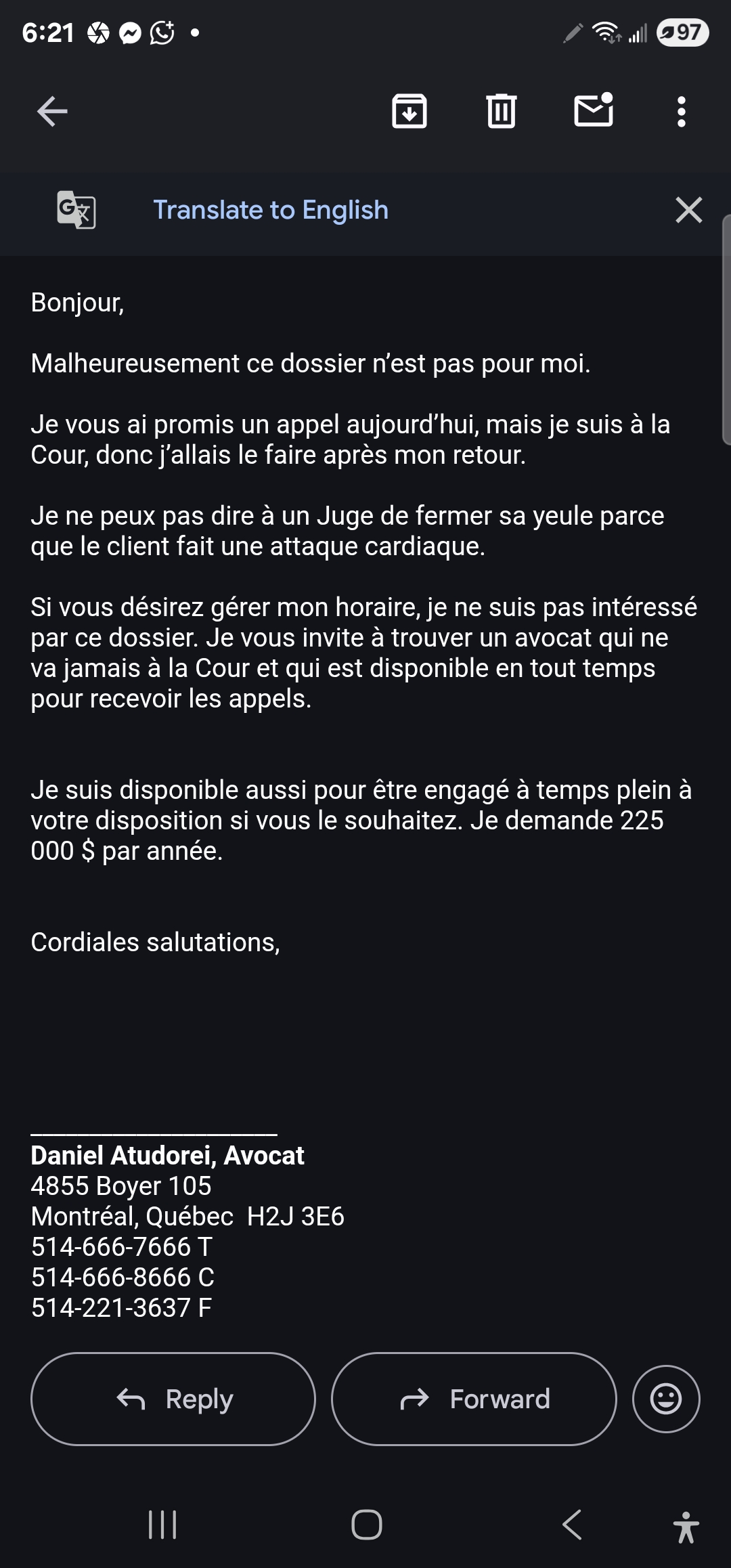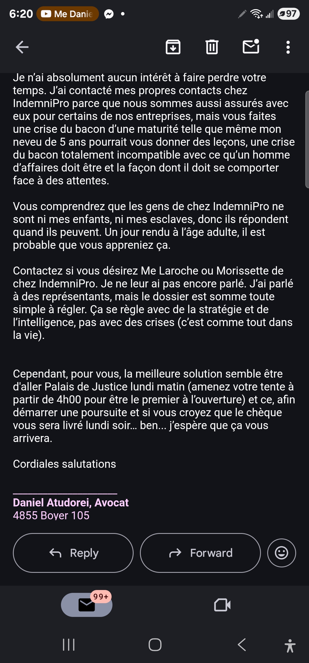 ⭐☆☆☆☆ Un “avocat”... ou un humoriste frustré en robe noire ? Si vous aimez les monologues arrogants, les courriels passifs-agressifs, et les “blagues” déplacées pendant que votre entreprise sombre, alors vous êtes à la bonne adresse. Après plusieurs semaines d’attente et de promesses creuses, Me Daniel Atudorei s’est permis de nous répondre avec un ton condescendant, une répartie de cour de récréation, et des insultes voilées du style : > “Je ne peux pas dire à un juge de fermer sa yeule parce que votre client fait une a... read more