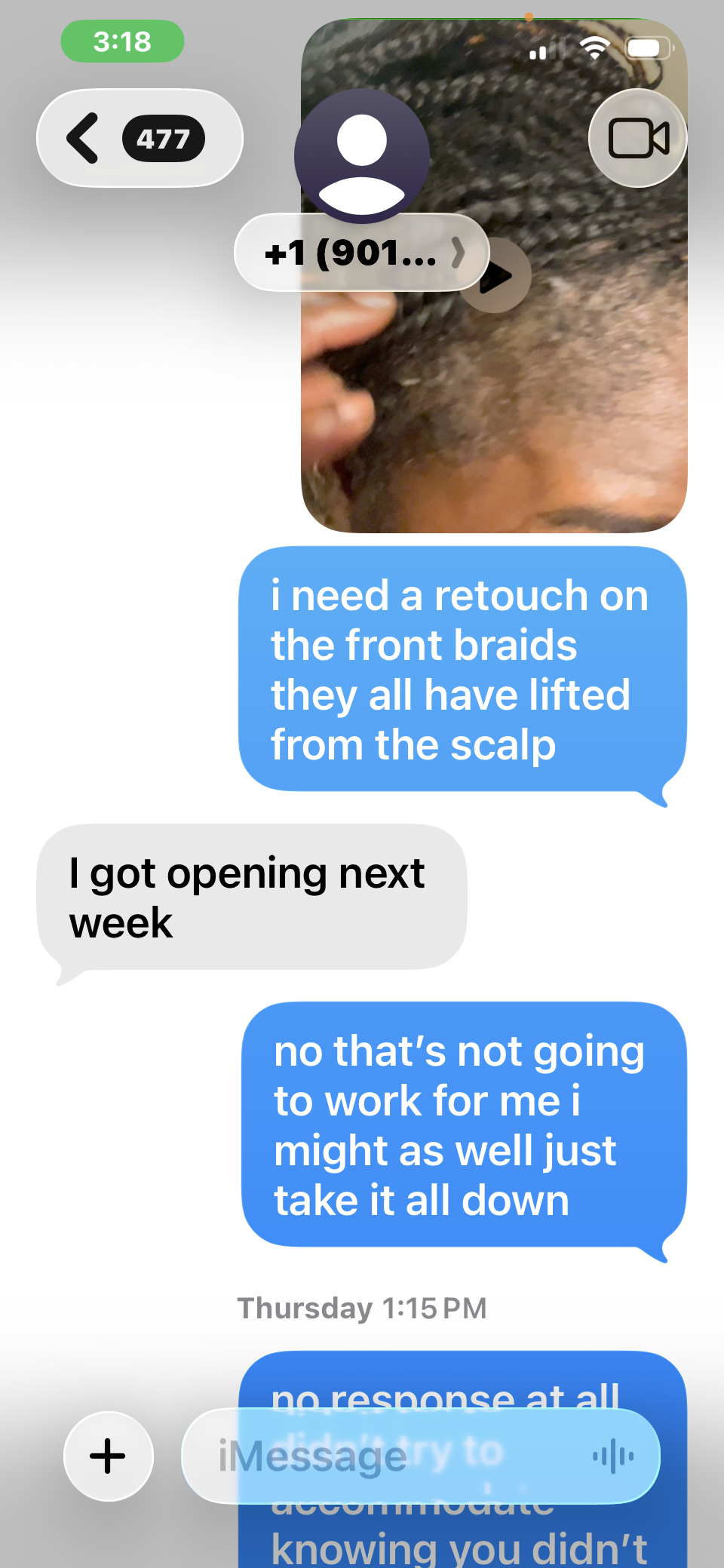 never again NEVER GO TO EBONI PAID $230 when i could have sat in someone kitchen for this hot MESS SHE THREW IPBIN MY HEAD BRAIDS FALLING OUT FROM THE ROOT BRAIDS UNRAVELING FROM THE ROOTA AS WELL POOR COMMUNICATION THEN I HAD TO GO OFF JUST FOR A RESPONSE BECAUSE SHE PLAYING WITH MY MONEY I PAID HER TO DO A SERVICE THAT WOULD LAST NOT FOR A WEEK SHE TOTALLY SCAMMED ME I HAD A HORRIBLE EXPERIENCE