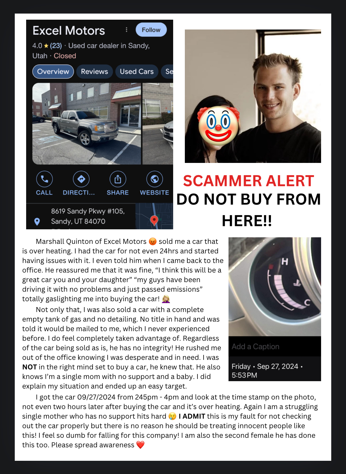 DO NOT RECOMMEND!! 0-10 DO NOT BUY FROM HERE!!! SCAMMER!!!! Marshall Quinton sold me a car that is over heating and I hadn’t had the car 24hrs… more specific it I’ve over heated with in two hours of having the car. I even told him when I test drove it and came back to the office and he reassured me that it was fine… it is in fact not fine! I also brought up a smell (which was regarding the over heating) and he completely dismissed what I said and only offered to spray stuff to help mask the smell but the car is just filthy!!... read more