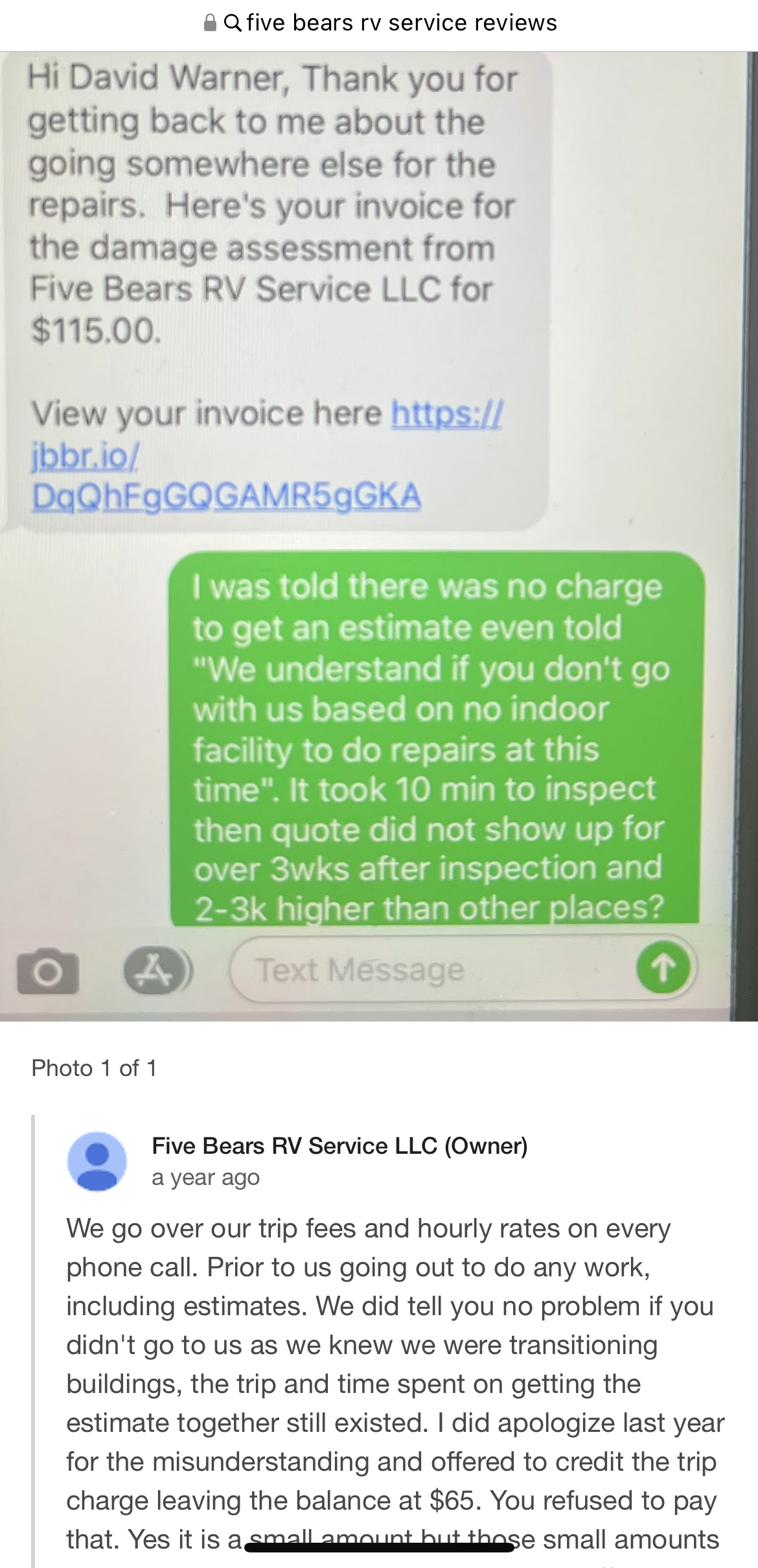 Avoid! Dishonest Shady business to deal with! Would give 0 stars if possible. We had a tree branch come through our RV roof around Oct. 28th 2022 per insurance I called around to get some quotes. I spoke with 5 bears and was told they could schedule a time to give me an estimate… At NO time was an estimate cost spoken of, and I was actually told "no problem if I did not go with them as they didn’t currently have the space to service my RV and were in transition of procuring another facility". A couple days later I received a... read more