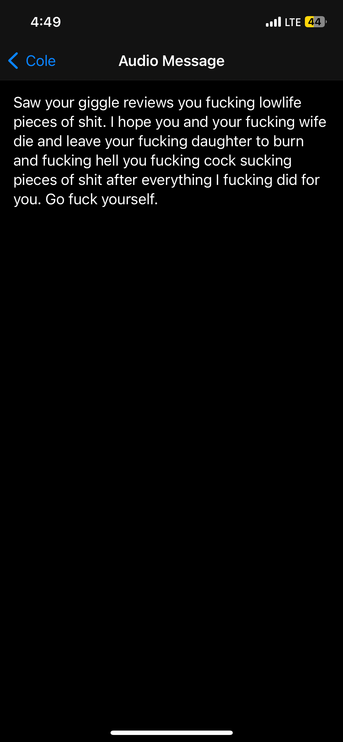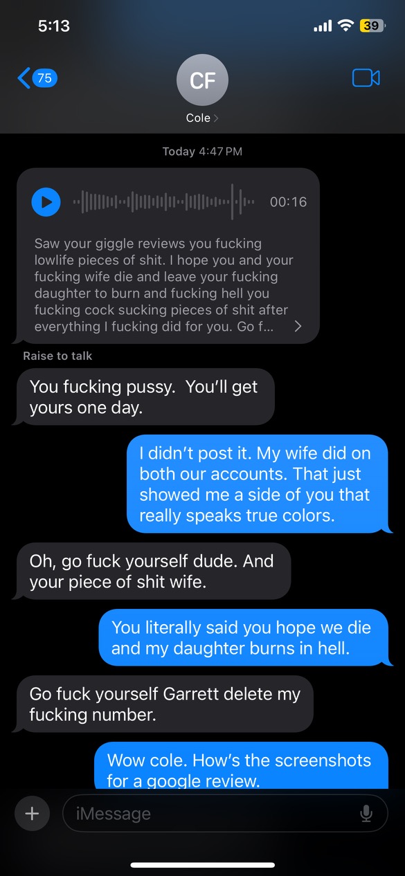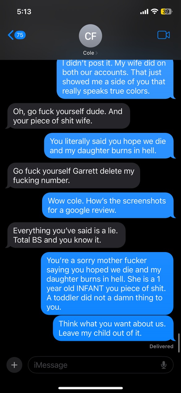 We recently left a property that Cole Frazier owns. He got really upset over a couple of things that happened and proceeded to send some nasty messages to my husband. When these screenshots were posted, he proceeded to reply back to the review stating that they were photoshopped. He's mad because he sent out an email begging for five-star reviews on his property because everyone was starting to leave and wanted to "up the marketing" on the property, and instead of complying with a perfect five-star rating, I told the truth a... read more