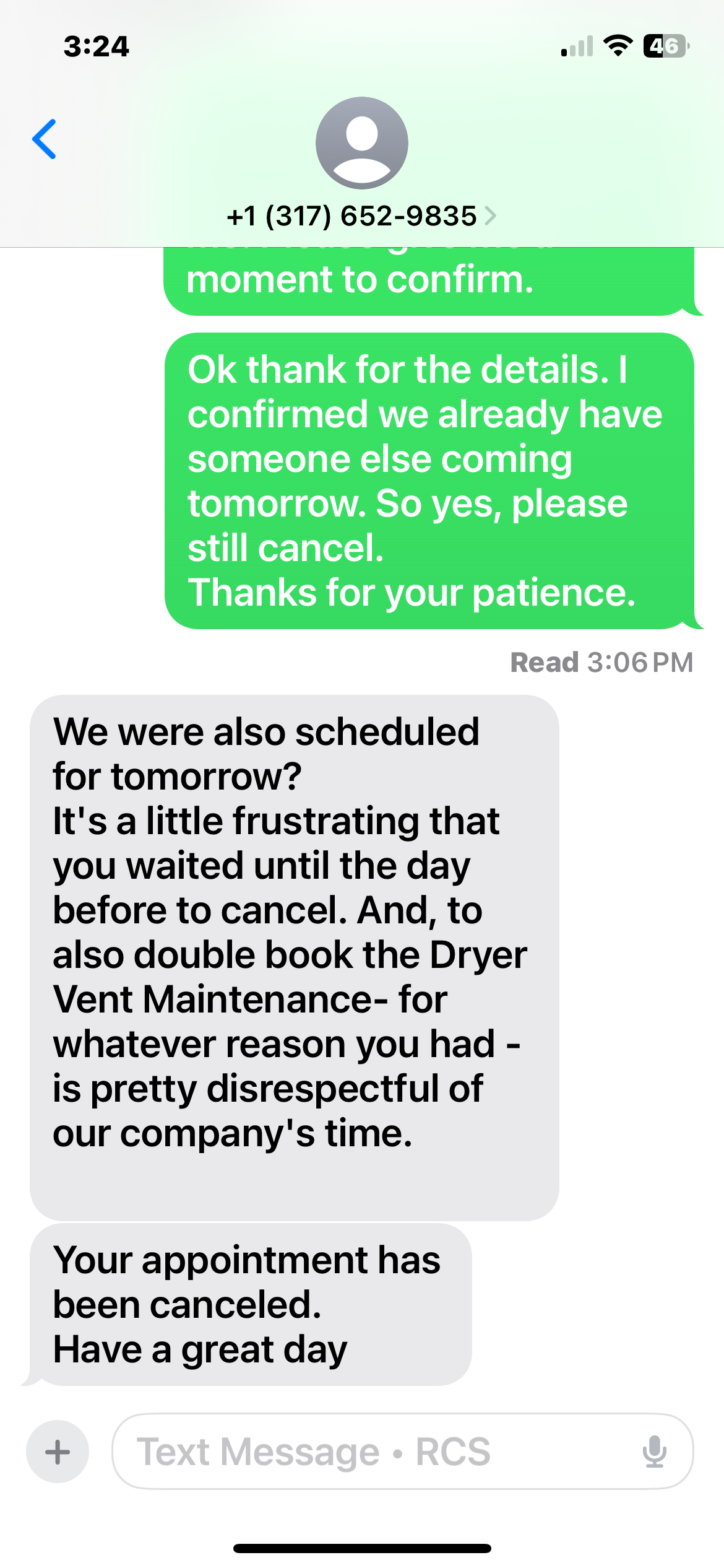 I’ll let the attached photo speak volumes, but here’s what happened: We booked an appointment with this company to have our dryer vents cleaned. With over 24 hours' notice, we decided to cancel the appointment the day before. In response, we received an unexpectedly rude message from John Price: "We were also scheduled for tomorrow? It's a little frustrating that you waited until the day before to cancel. And, to also double book the Dryer Vent Maintenance - for whatever reason you had - is pretty disrespectful of our compa... read more