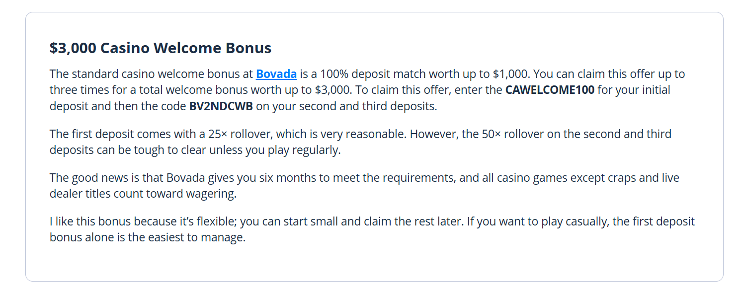 As a casual casino player, I found GamblingNerd.com really helpful when I was looking to claim a new sportsbook bonus from Bovada in the USA. The breakdown was clear, especially around the promo code and rollover requirements, which saved me from missing key terms. I liked that the review didn’t just hype the offer and it explained who the bonus was actually good for and what to watch out for. Overall, it felt straightforward, informative, and written by people who actually understand how these promos work.