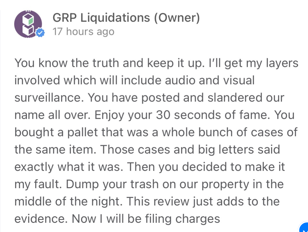 Beware, NOT HONEST! Lies! Deleted my comments off from their page to create a story the way they (Mitch and Jess) wanted to tell it… versus the truth. I purchased a “Stacked Clear Wrap Premium” pallet this past weekend for $900 after Mitch said, “These have approximately $9k retail on them give or take”. Items such as high end cookware, kitchen items, home goods, car parts, etc were described when asked what types of product we can expect. Never did he mention food. What we received was a pallet that contained solely 30 c... read more
