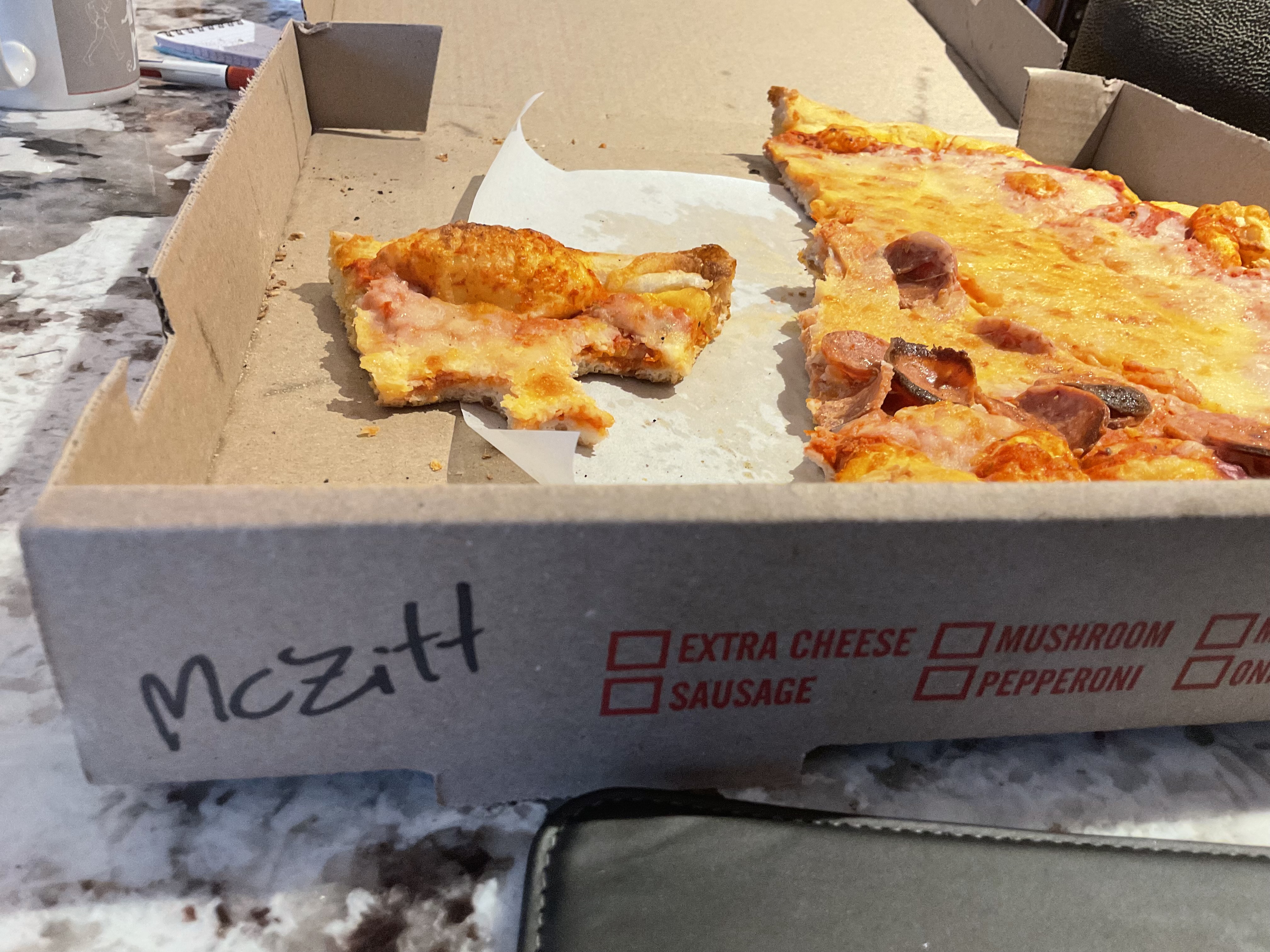 I have done a lot of bragging about this place over the past decade and have sent many people through their doors. But thanks I got from last night‘s order ends this love affair … Thin and greasy pizza, overcooked wings and an insult to my last name on the pizza box and wing container. McZitt… really? Never again Horsebrow!