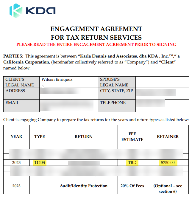 Upon first engaging with KDA Inc in August of 2024, I spoke with Sharyce about 2023 tax prep filing. We went through the initial consult and when it came down to the pricing question she said it “depends on how long it takes” to file each return. I knew I had 2 business tax returns that had $0 revenue activity because they were just started so it was not going to take long at all. It would be a $750 retainer up front and then based on time, I would get charged the difference. Pretty standard for tax preparation. Then, when... read more
