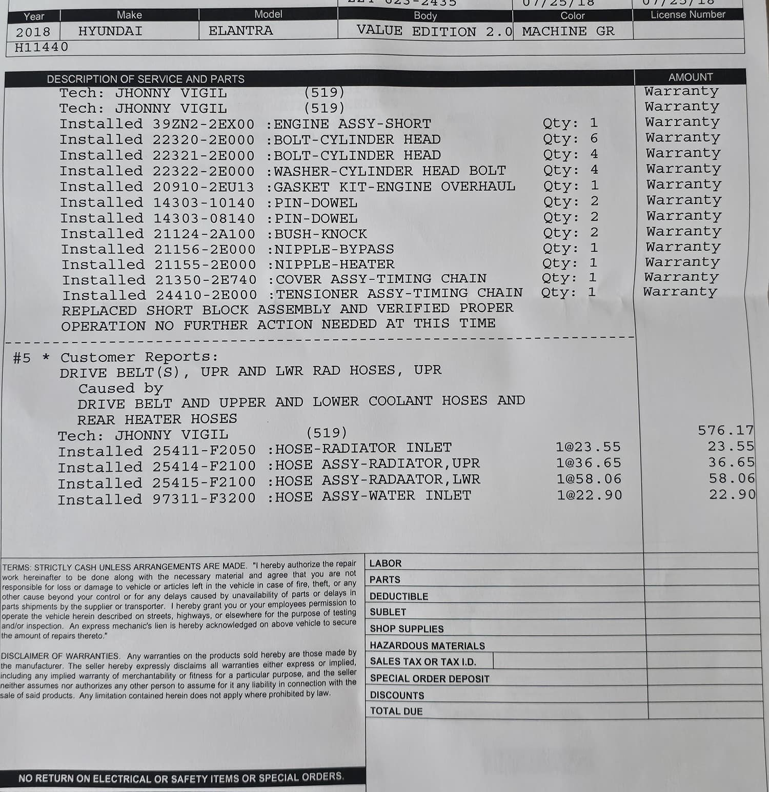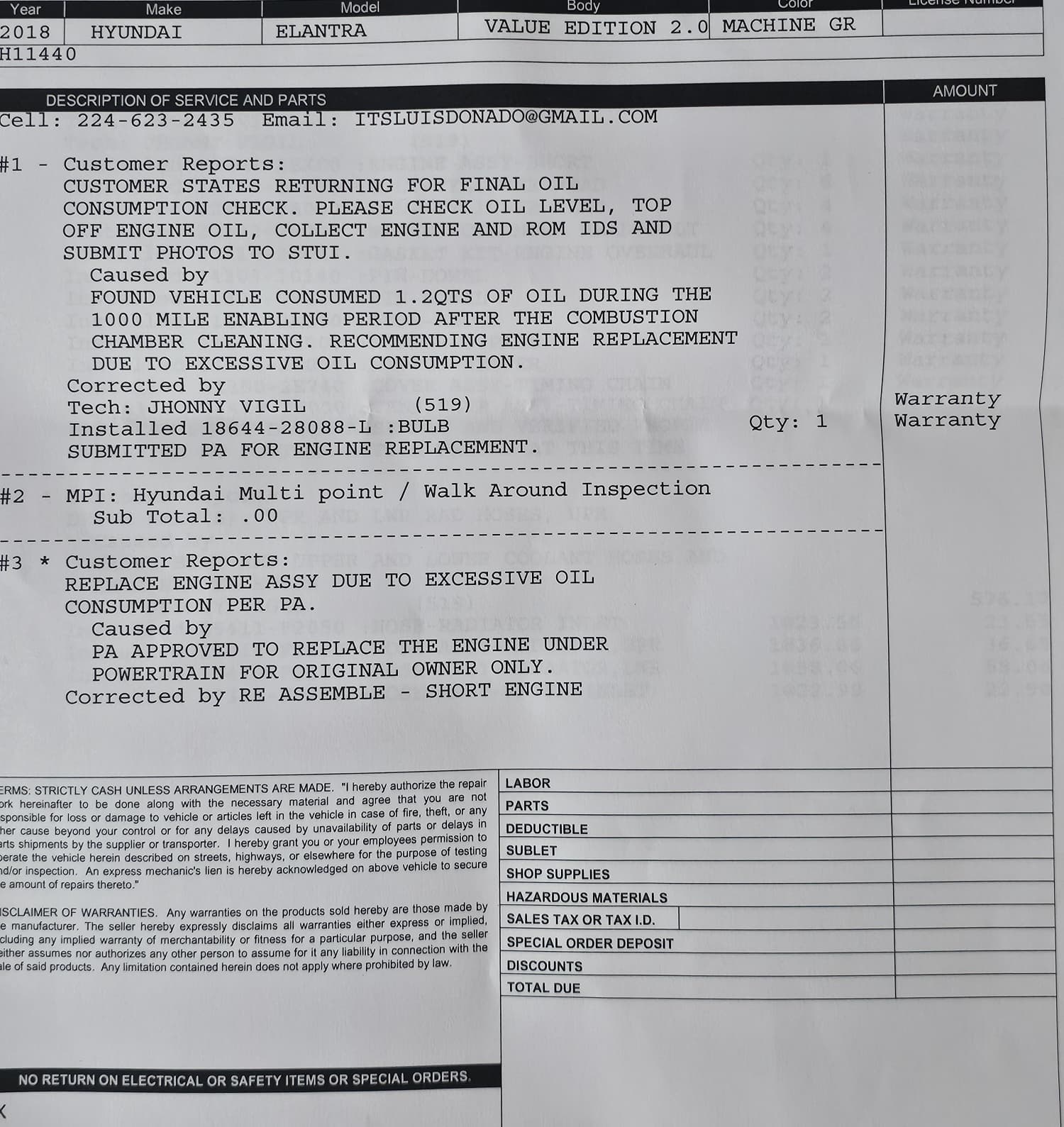 "Warranty Repair Mishandled – Charged for Work Caused by Defect" Hyundai confirmed our Elantra had excessive oil consumption and approved a warranty engine replacement. But the dealership only replaced the short engine block, not the full engine. On top of that, we were charged nearly $900 for belts and hoses that were only replaced because of the engine defect. These weren’t normal maintenance jobs — they were part of correcting Hyundai’s known issue. We expected full warranty coverage and fair treatment, not extra charge... read more