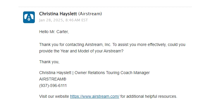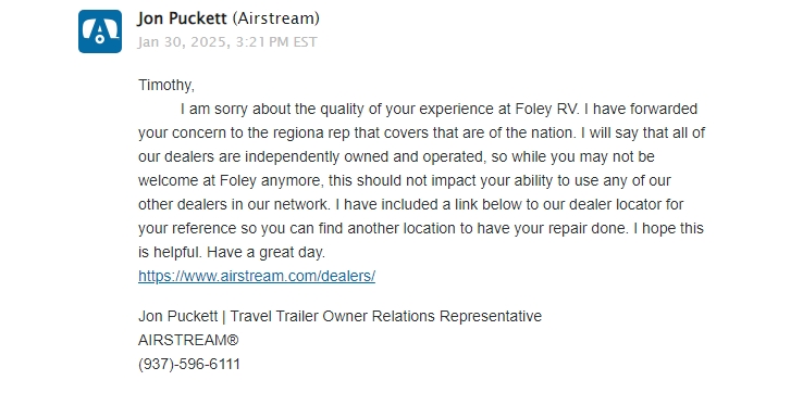 airstream has the worst customer service I've ever seen in my entire life Fair warning if you have an airstream that's already paid for that's not brand new under warranty these people could care less about you in your airstream This is what they do to a 9-year customer that's disabled Instead of apologizing to me I've been ignored by the main office along with Foley RV Center Airstream of Mississippi Because I have an Airstream that's paid for and no longer under warranty They refuse to have me as a customer Just for tryin... read more