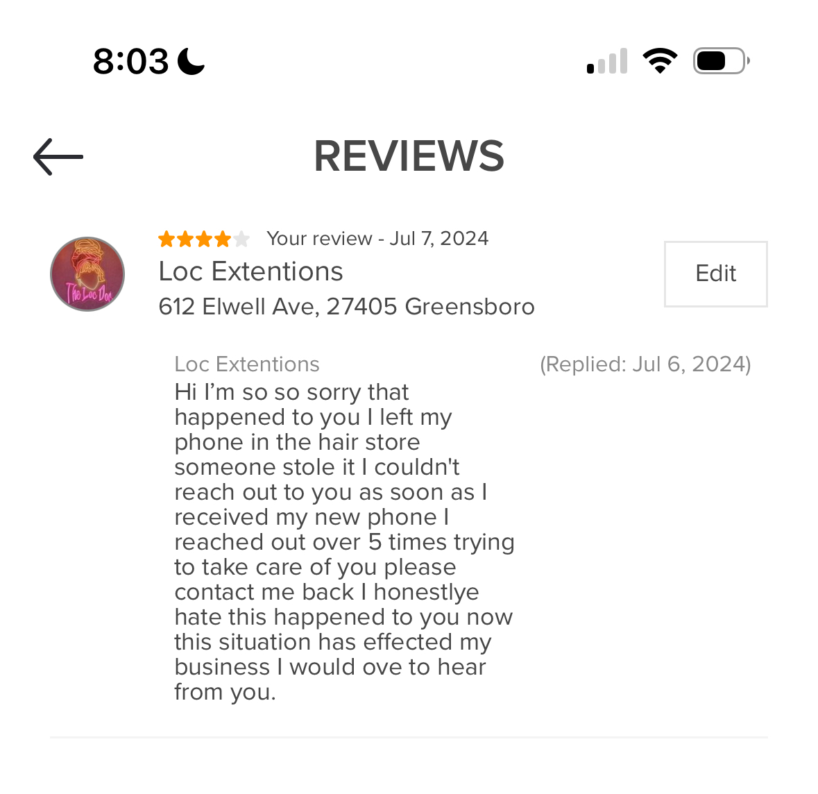 Do not go to this woman, she will scam you.. I had to go to an out of town funeral back in 2024 and I needed my locs retwisted. I thought she was legit and the day of my appointment, she ignored me the whole day. The next day she claims her phone was stolen but I was already out of town and didn’t want none of her services in the future. Yesterday morning I woke to her charging my card smh I already talked to my bank and this company called Booksy as well and let them know the situation