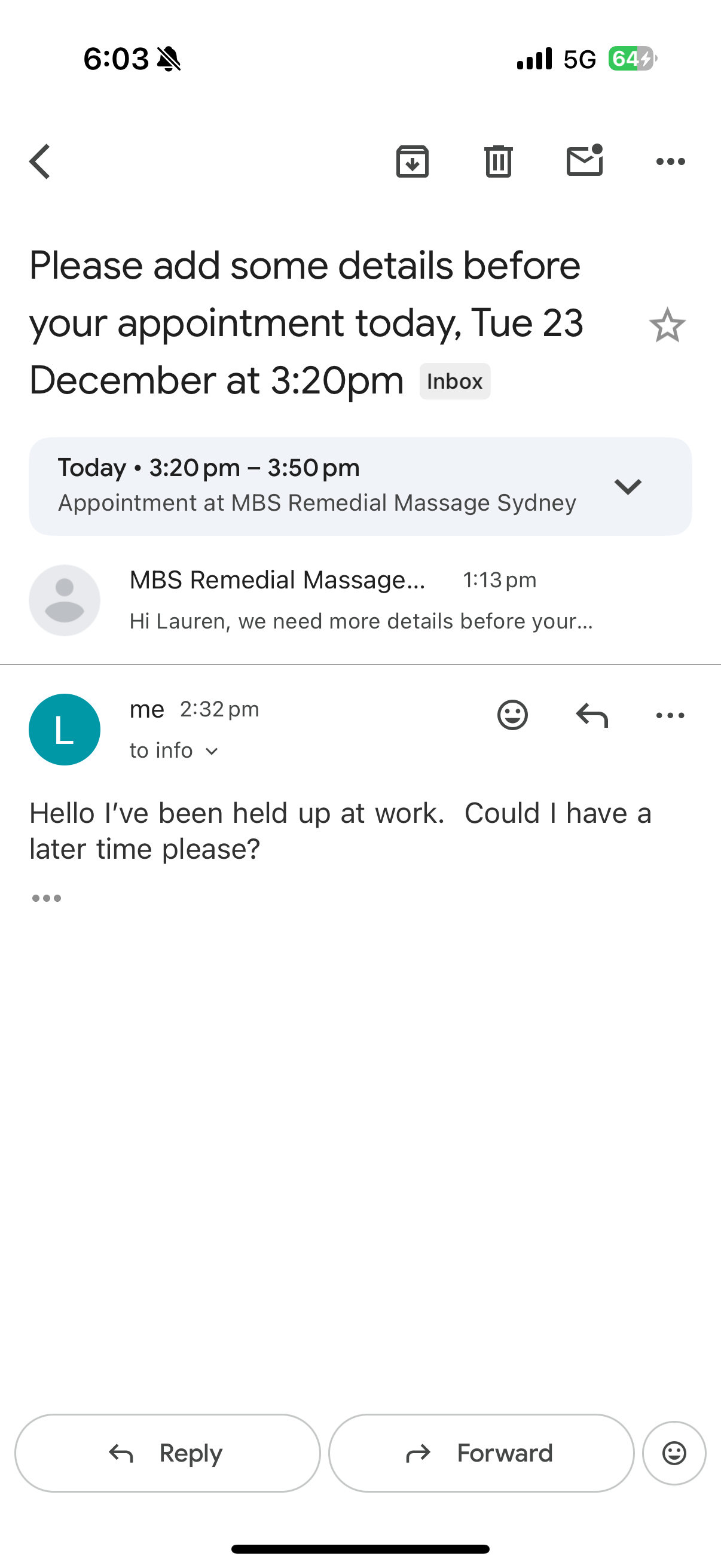 Terrible. Do not book with Sapphire under any circumstances. I made a booking for a massage in the cbd. I had a meeting that went longer than expected so emailed them one hour before to ask to push back the massage time. They failed to answer the email (there is nothing in their email correspondence to say you can’t communicate with them that way and the email didn’t bounce back). I called them five minutes before to chase up their response to my email and they said since I called them so late I have to pay the full price. ... read more