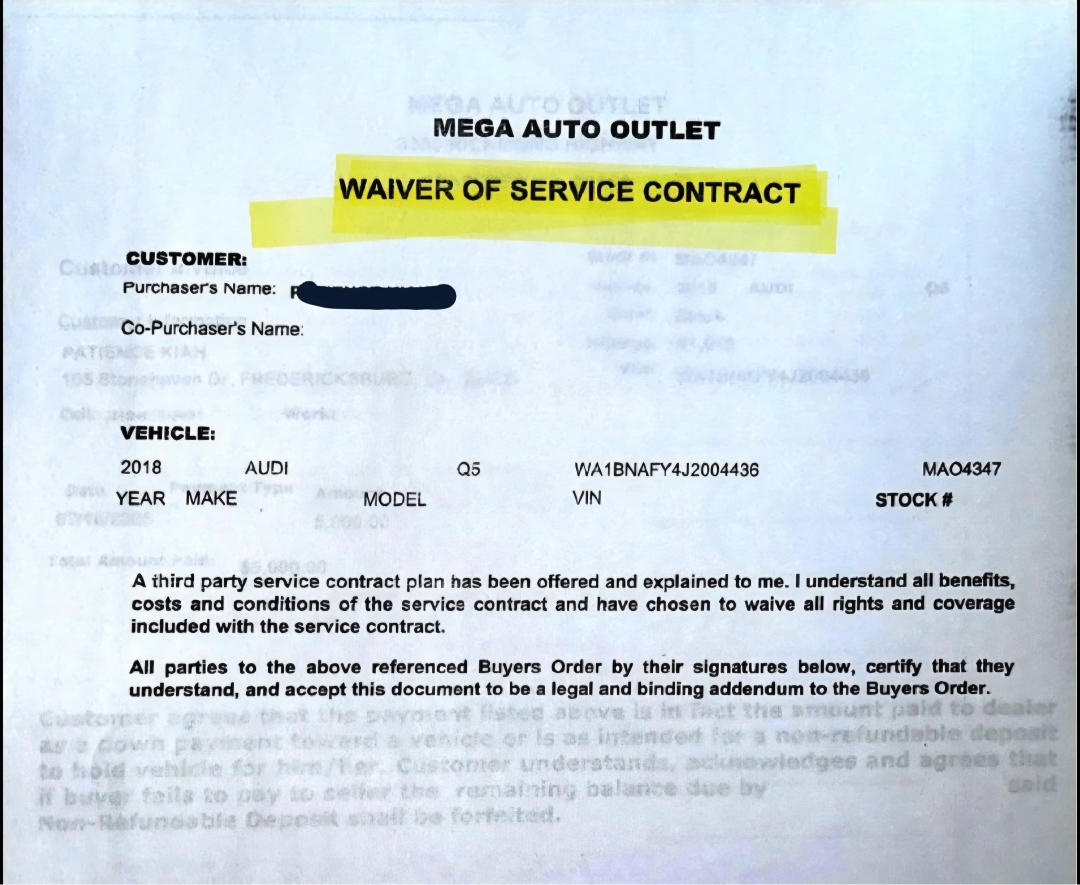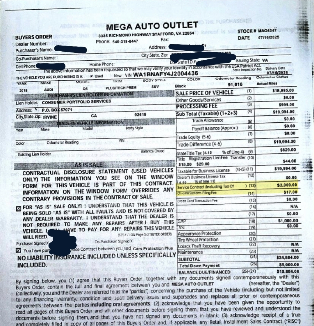 Mega Auto Outlet should be called SCAM CITY, not only did they inflate the price from what they had listed online. They quoted me a price of 13k then added frivolous charges to my contract which added up to 24k. Insane. In addition, they charged me $3000 for a service contract yet I decline the service contract. They guys are operating fraudulent business practice. I’ve reported them to the Virginia Motor Vehicle Dealer Board. I IMPLORE EVERYONE TO REPORT THEM TO THE VIRGINIA MOTOR VEHICLE DEALER BOARD SO THAT THEY CAN LOS... read more