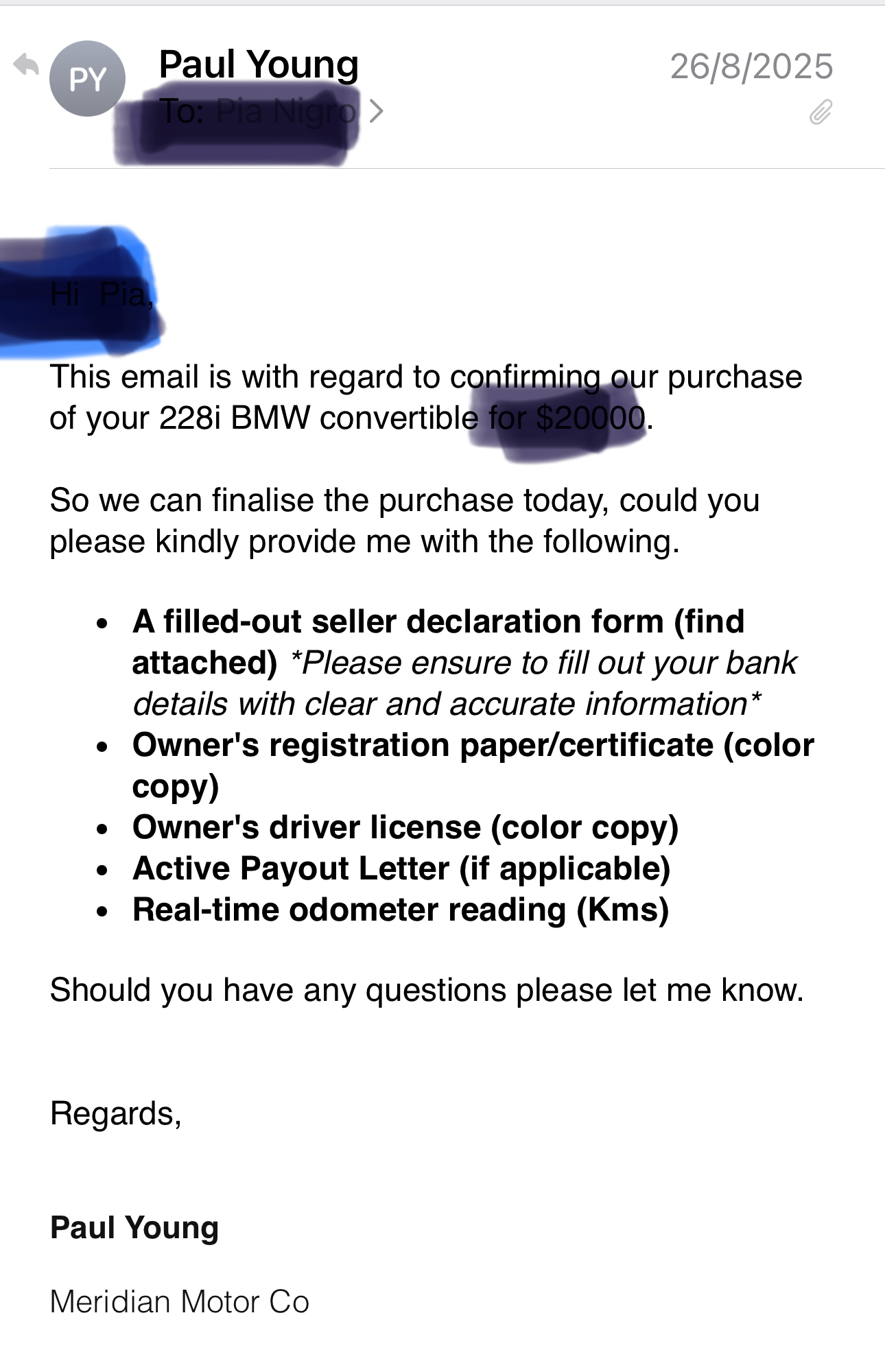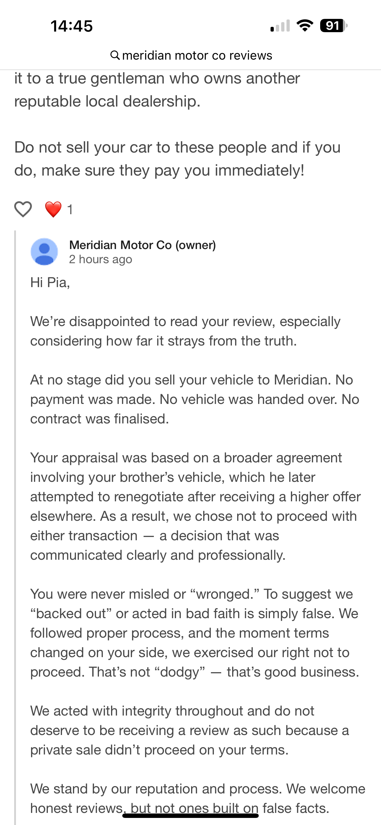 I wrote a review on Meridian Motor Group Five Dock. Their reply was full of lies They clearly forgot that they sent ne the Contract to sign and details of the purchase of my car via email. I gave read many other reviews about their unethical modus operandi when it comes to offered the seller a price and then backing down.