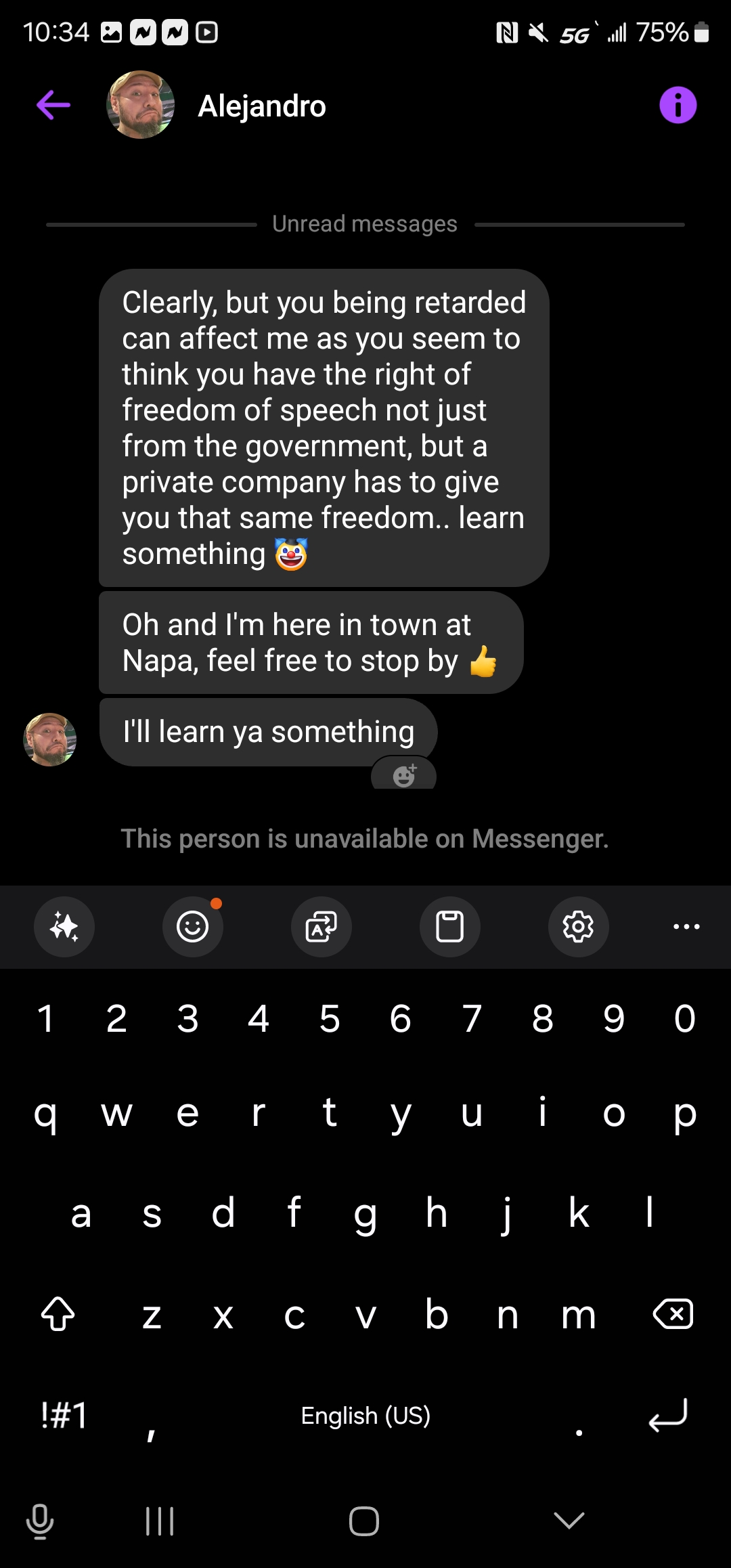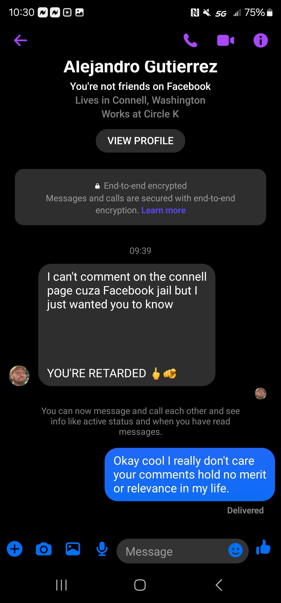 Your employee named Alejandro Gutierrez threatened me over Facebook messenger. When I don't even know him. He decided to message me out of the blue calling me "Retarted." And left a open ended threat of "I'll learn ya something." Before blocking me and leaving me to my own devices on what he had meant. I'm the victim here and I get a call from a private number for 0:26 seconds telling me to Cease and Assist when I did nothing wrong at all. All I did was tell him that "your comments have no relevance or merit to my life." Bu... read more