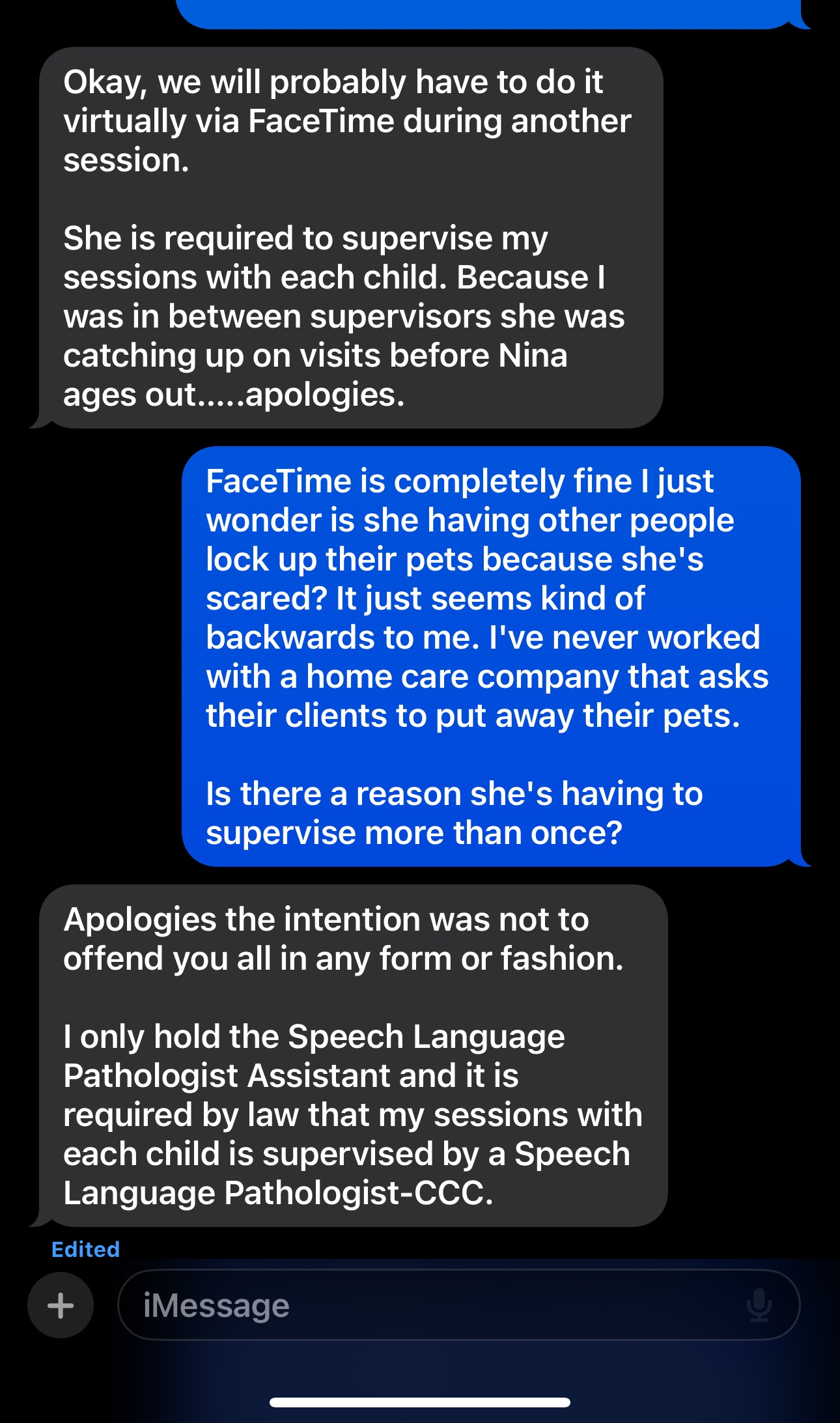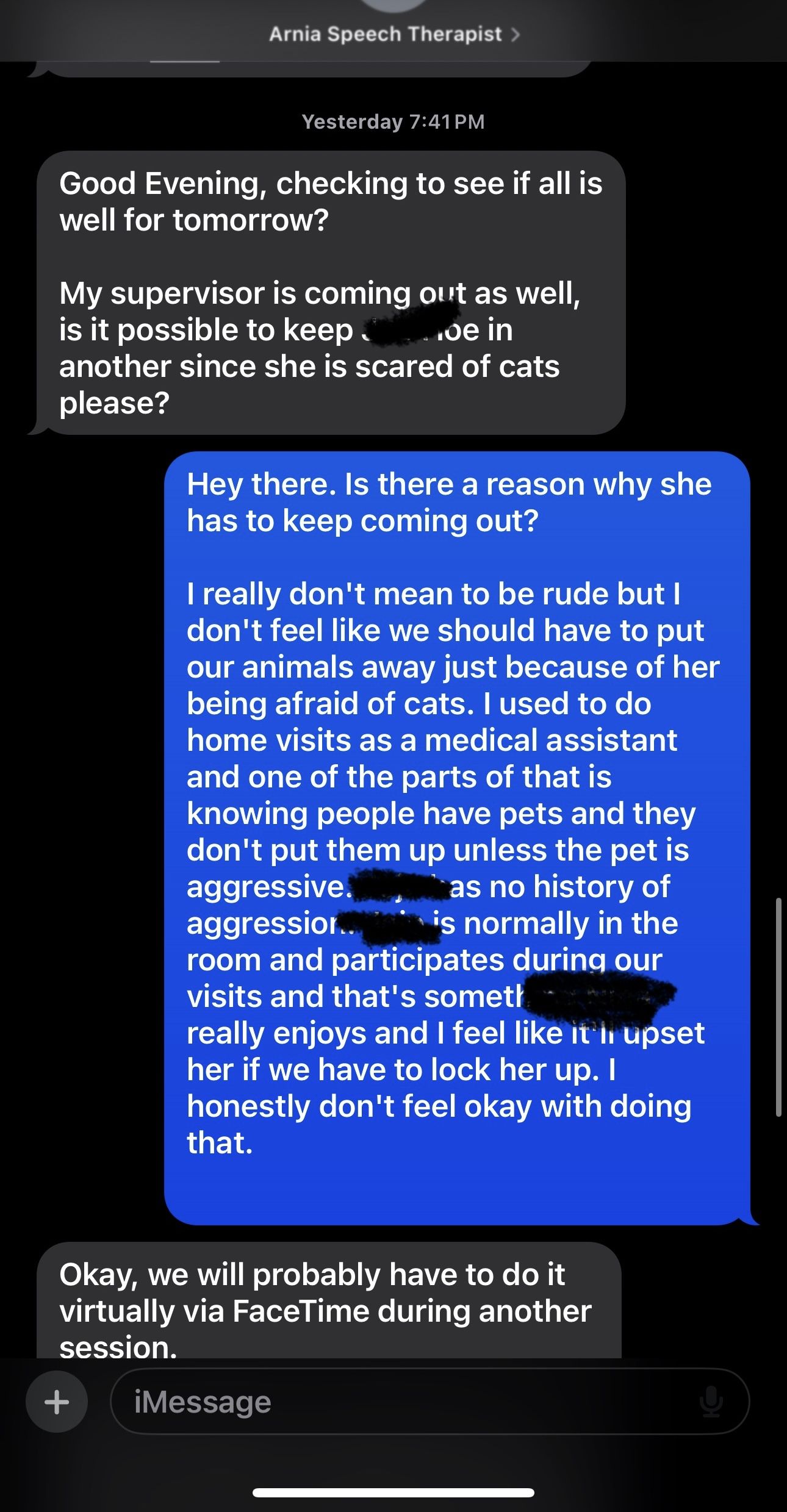 DO NOT USE THIS COMPANY FOR SPEECH SERVICES! We had been seeing them in our home for several months. Before we began services, we made sure they knew we had pets and they said that was no problem. We have 2 cats and a dog, our dog and older cat are locked up during session just because they can be distracting but our daughters cat will sit in session with her while she completes speech therapy. We had Arnia as our speech therapist and besides her being 10-30 minutes late every other session, she was great with our daughter a... read more