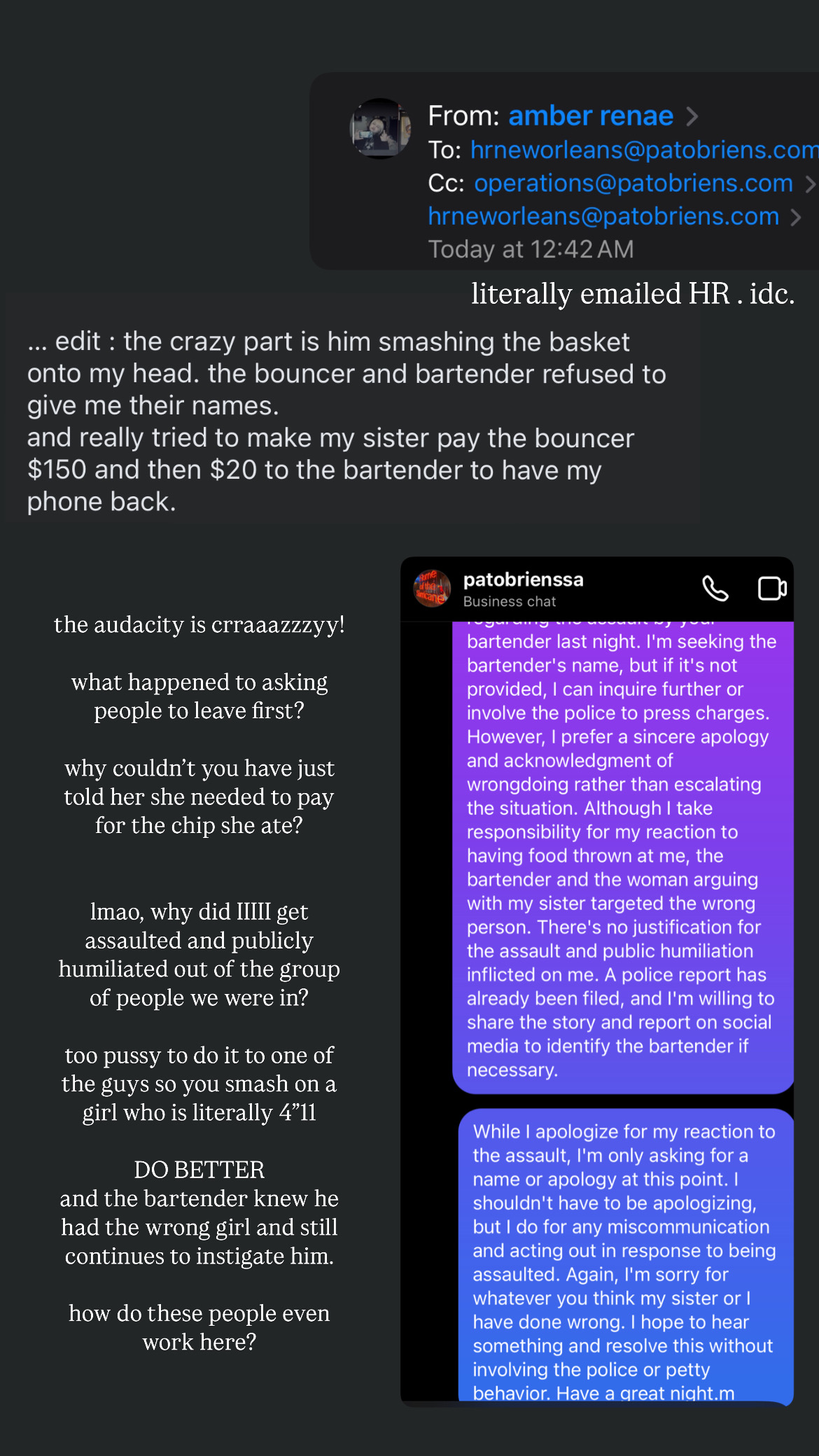 ‼️I’d be more content if this got shares, versus making a police report and/or using petty behavior. ‼️BUT a simple apology would trump ALL ‼️ Upon arrival at Pat O'Brien's, the atmosphere was cool. My sister noticed chips and dip, and without thinking, she attempted to take one. Unfortunately, she was reprimanded for trying to dip the chip, which I found amusing and couldn't help but laugh. Undeterred, she proceeded to pour the dip onto the chip instead of dipping, and we continued on. I then observed the lady who had admo... read more