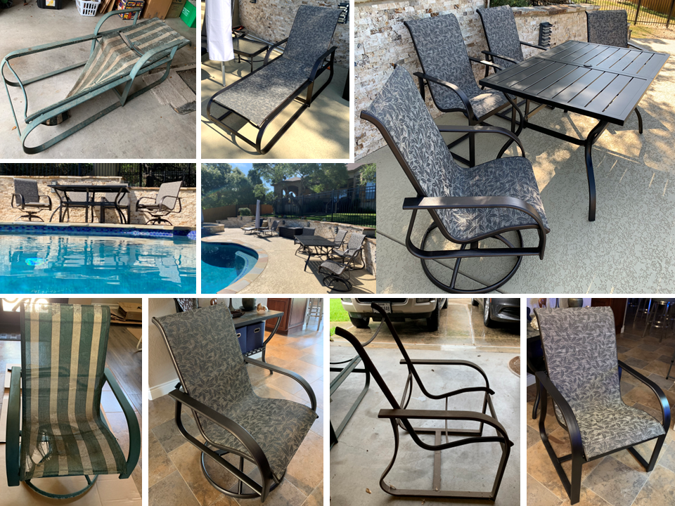 I originally purchased my Winston outdoor patio furniture back in 1993, when green frames and wide stripes were all the rage. Five years later I had to move and my new house didn’t have much outdoor space, so almost all of the furniture had to be stored in the dirt under a raised wooden deck. The swivel chair and small end table that I kept out for use eventually got repainted to a medium brown color and I had a patio store install a new sling. I recently moved again and now have the perfect place to use all of my old f... read more