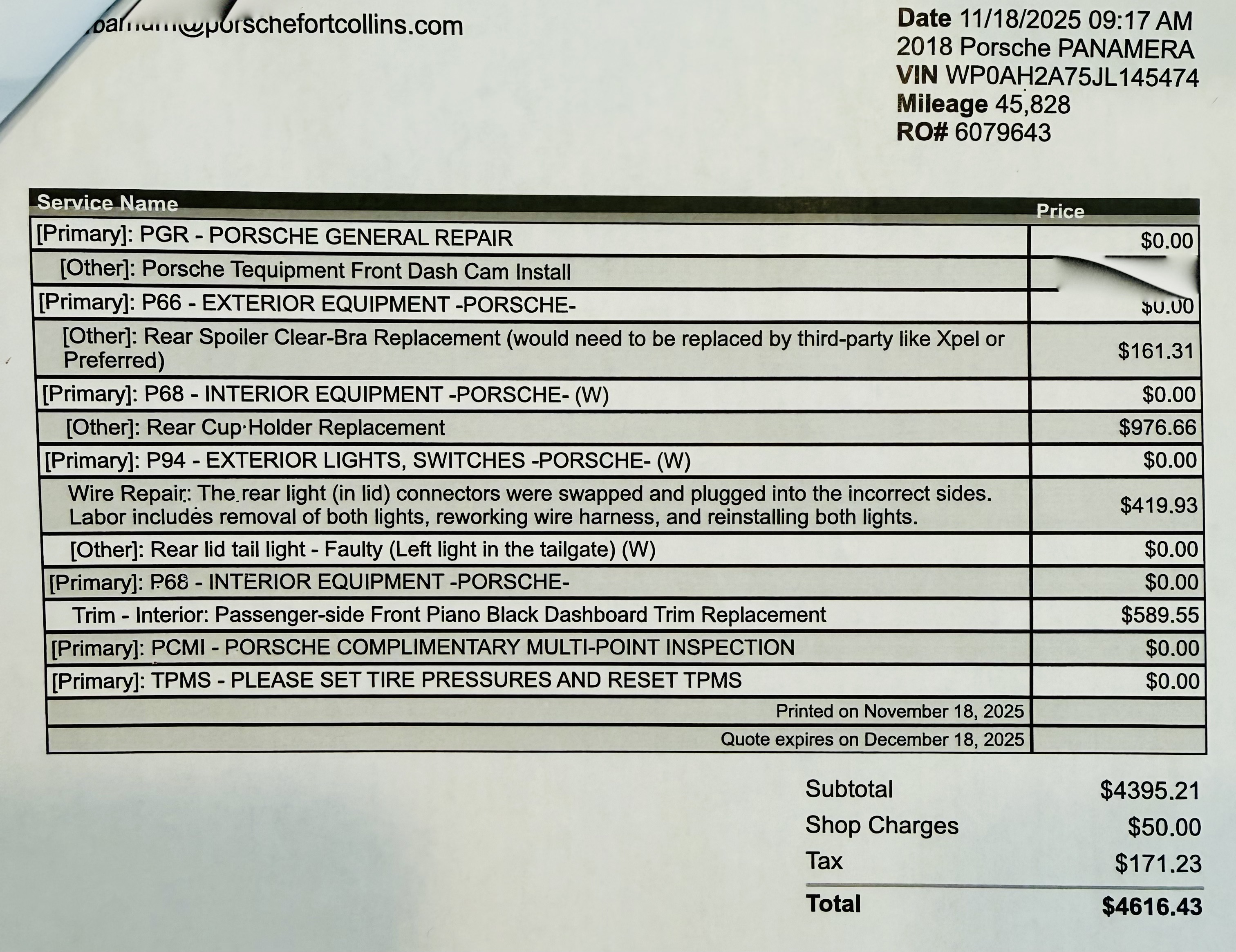 Bought a CPO Panamara Turbo S, over $83K, needed 3 weeks at the local Porsche Service Shop in Colorado for issues they missed, nearly $3000 in repairs not caught in the CPO process, like throwing fault codes, warning lights on the dashboard that taillights are out. Not sure who did the 150-point inspection, but they missed a lot in this car. Stains on the leather seats; Herb Manning, my salesman, stated that I had to have it detailed (see text). Said they would reimburse me, but they never have. Multiple calls, my salesman, ... read more