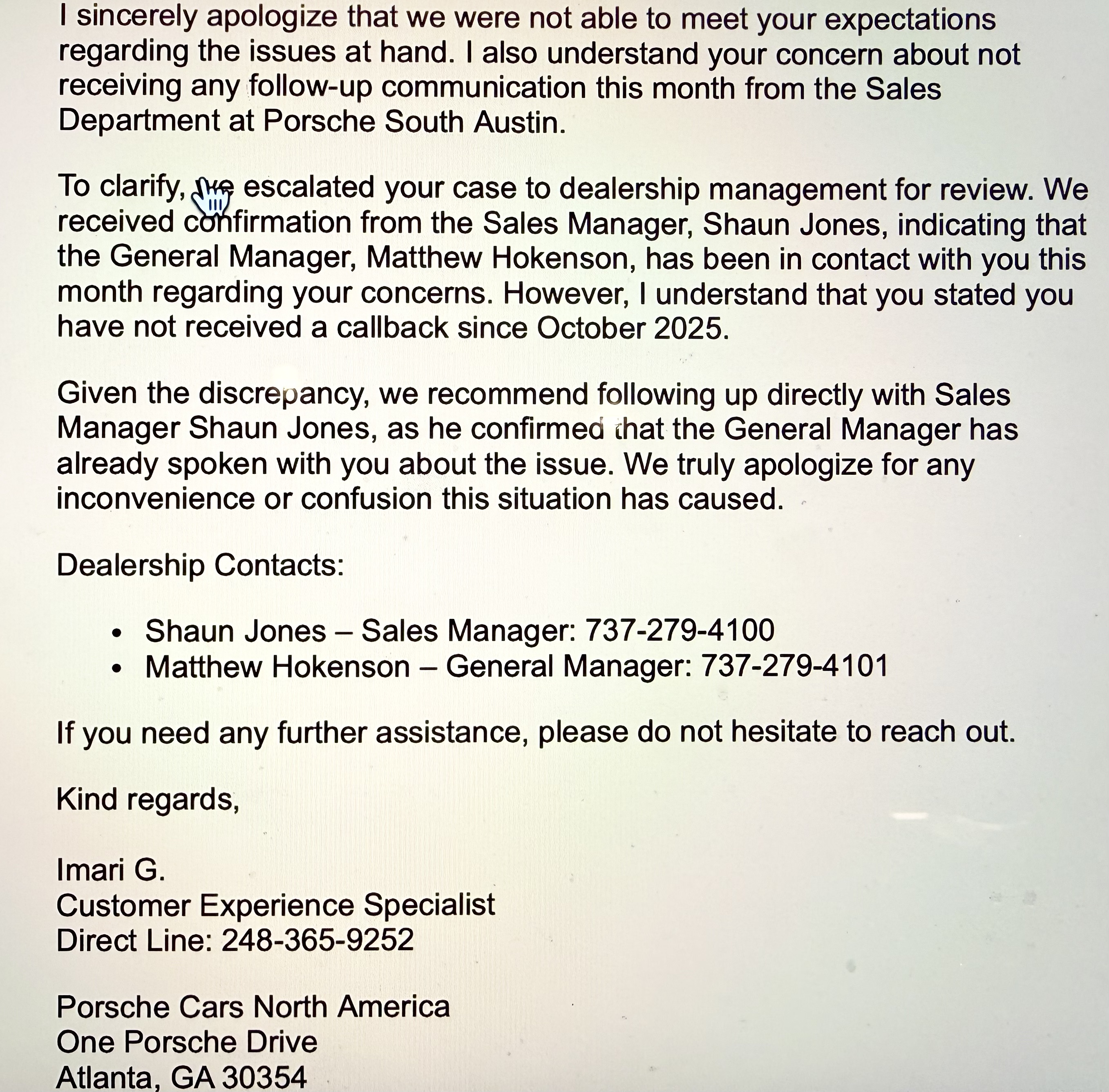 As I said in my previous review of Porsche of Destin, "the sales guys like Tommy know their stuff and resist any pressure just for a "sale." Tommy knew everything about my Porsche 911 and has gone out of his way to call and check on me to see if I needed help..." Here's the next part of the story...I was having trouble with the car's PCM...I called Tommy and said..."help me please!" I've had a total of 4 Porsche automobiles, and I've never had the great care and responsiveness of this dealership before. Tommy said "... he... read more