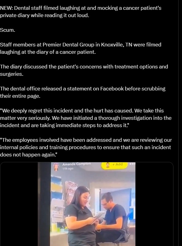 I watched a video of 3 of your employees on tiktok openly reading and laughing at a patients private journal in your office. . I am pretty sure that you are aware of privacy laws such as HIPAA where it doesn't even matter than they did not say his/her name for this to be a serious violation of this persons privacy . Your business is now at a serious threat of losing its licensing as well as impending limitations that can arise. I hope you do the right things here