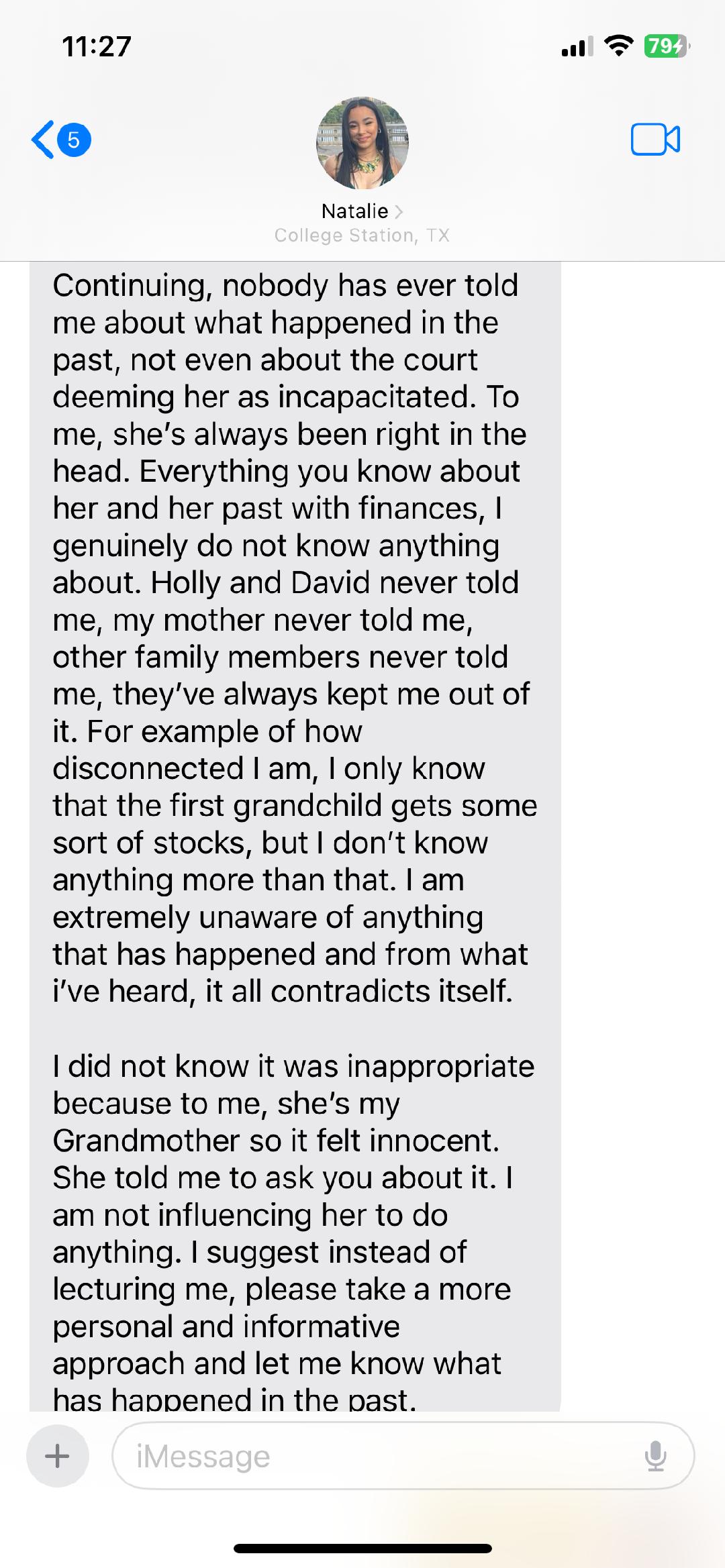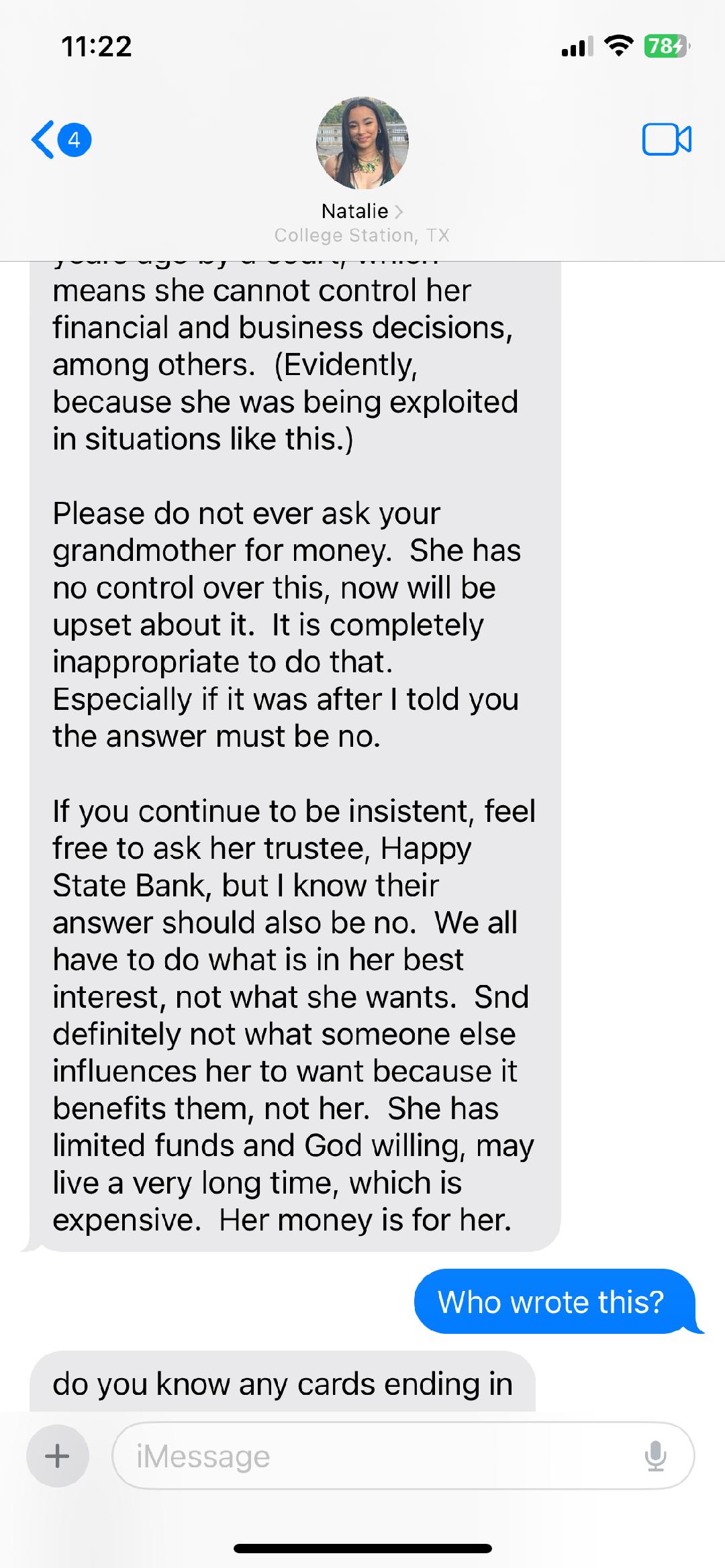 My daughter reached out to Collen about an International Agribusiness trip she's taking over the holidays. Her grandmother said reach out to Colleen, Colleen's over her finances. The tone in her text exchanges was NASTY. Colleen’s behavior was disgraceful. She spoke to my daughter with no respect, treating her as if she were beneath her. She even accused my daughter of trying to exploit her own grandmother for money—despite the fact that this grandmother sends her 1st grandchild who she adores gifts for birthdays and Christm... read more