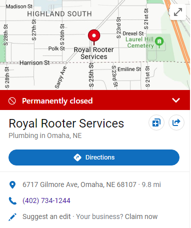 Service was great, prompt, and I'm well satisfied. For your information. I'm sending a picture of the web search that was a bit confusing for me. It indicates that you are permanently closed. Here's the search link I went to when I just plugged in "Royal rooter plumbing" in the Microsoft search engine. A scroll down the page will bring you to the picture in this message on a side bar. https://www.bing.com/search?q=royal+rooter+plumbing+omaha+nebraska&cvid=8c51f4e9da174501ab3f68a750a44a07&gs_lcrp=EgRlZGdlKgkIABBFGDsY-QcyC... read more