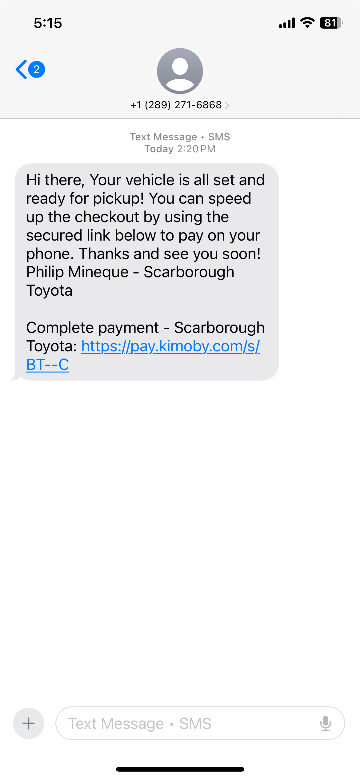 Today's visit was rubbish, Saturday, August 09, 2025 - 2025-08-09. Waisted my time without fixing the headlights and lamps, charged me over $100 for nothing. Only advisor responsible was at the service desk was PHILIP MINEQUE 2463 By 4 PM Vehicle supposed to be fixed and ready. I don’t recommend rubbish talk advisors, initially he wrongly advised wrong bulb which was given by Toyota parts in April 2025. This is propaganda sms, vehicle headlights not fixed and unnecessary charged Sirajuddin, you spent $101.70 at SCARBOROU... read more
