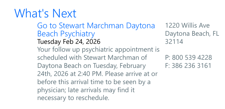 I am writing this review to document my experience with Stewart‑Marchman in Daytona Beach after Halifax scheduled a required follow‑up psychiatric appointment for me. My “After Visit Summary” from Halifax clearly listed a scheduled appointment on Tuesday, February 24th at 2:40 PM, with the instruction: “Please arrive at or before this arrival time to be seen by a physician; late arrivals may find it necessary to reschedule.” I arrived at 2:39 PM, fully on time. Despite this, the receptionist told me that appointments were ... read more