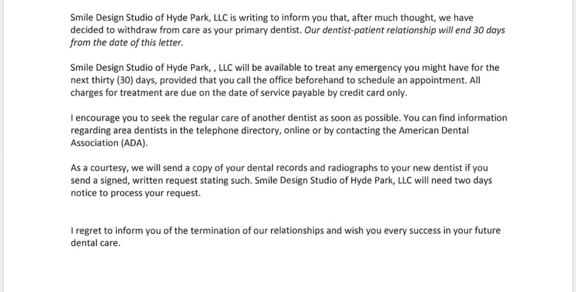 Please stay away from this dental care. I went a couple of times (always on time) to check for a crown and a wisdom tooth. They suddenly without explanation after I had paid for all the scans and checkup terminated the relationship as the letter below without a single word of explanation. This is proper mistreatment to receive all this money for scans and then decide not to treat me without a single word of explanation. They might have realized they were at capacity but they should have realized this before starting treatmen... read more