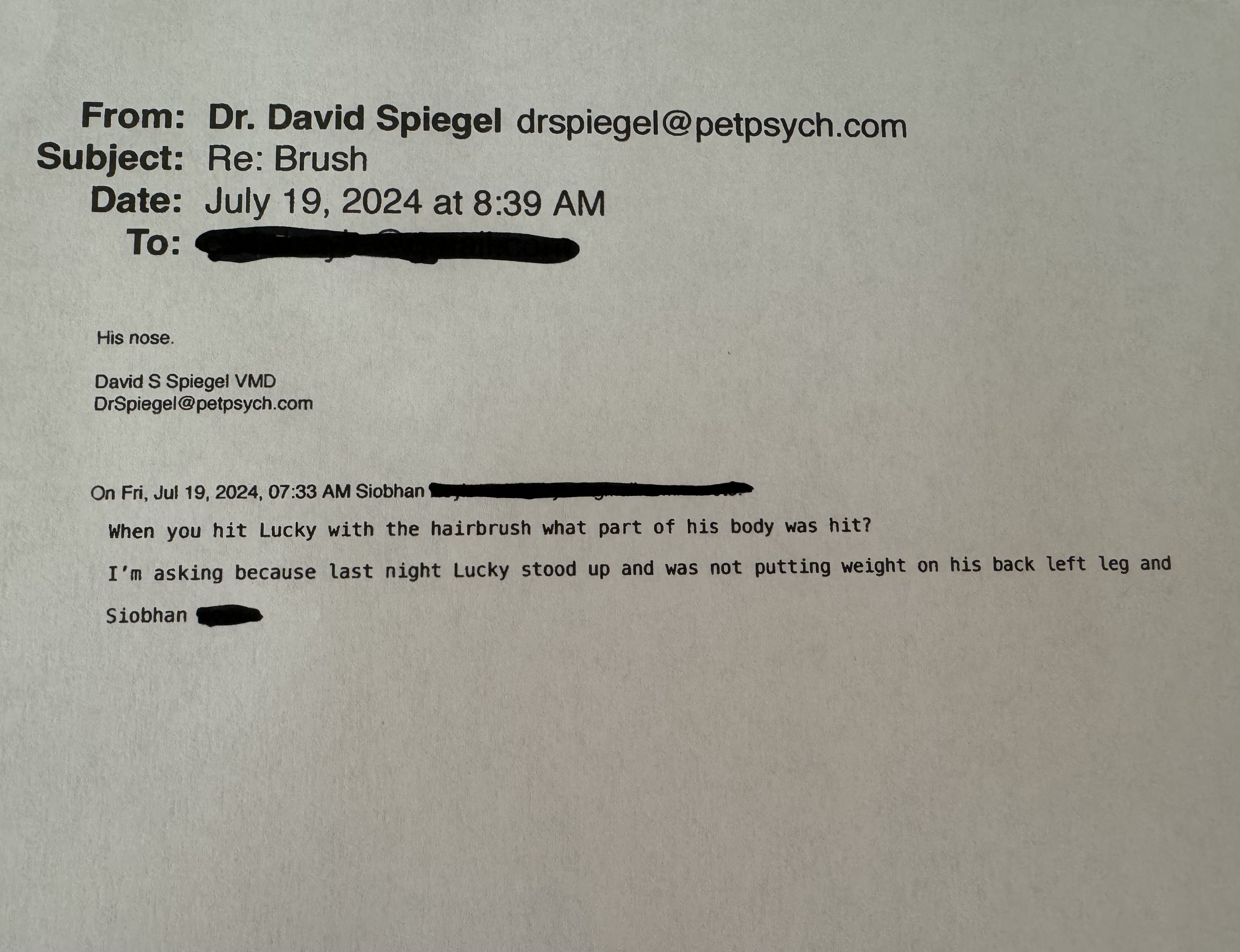 Dr. Speigel hit my dog in his face with a wood paddle hairbrush. He was trying to brush my dog on his back leg and my dog growled at him. He screamed at my dog, held him down on the floor by his shoulders and then hit him in the face HARD with the hairbrush. My dog came staggering out of the room dazed and terrified and tried to walk to the door to escape. I reported this incident of animal abuse to the Swarthmore Police and he admitted to the officer that he hit my dog in the face with the hairbrush. He also wrote in my dog... read more