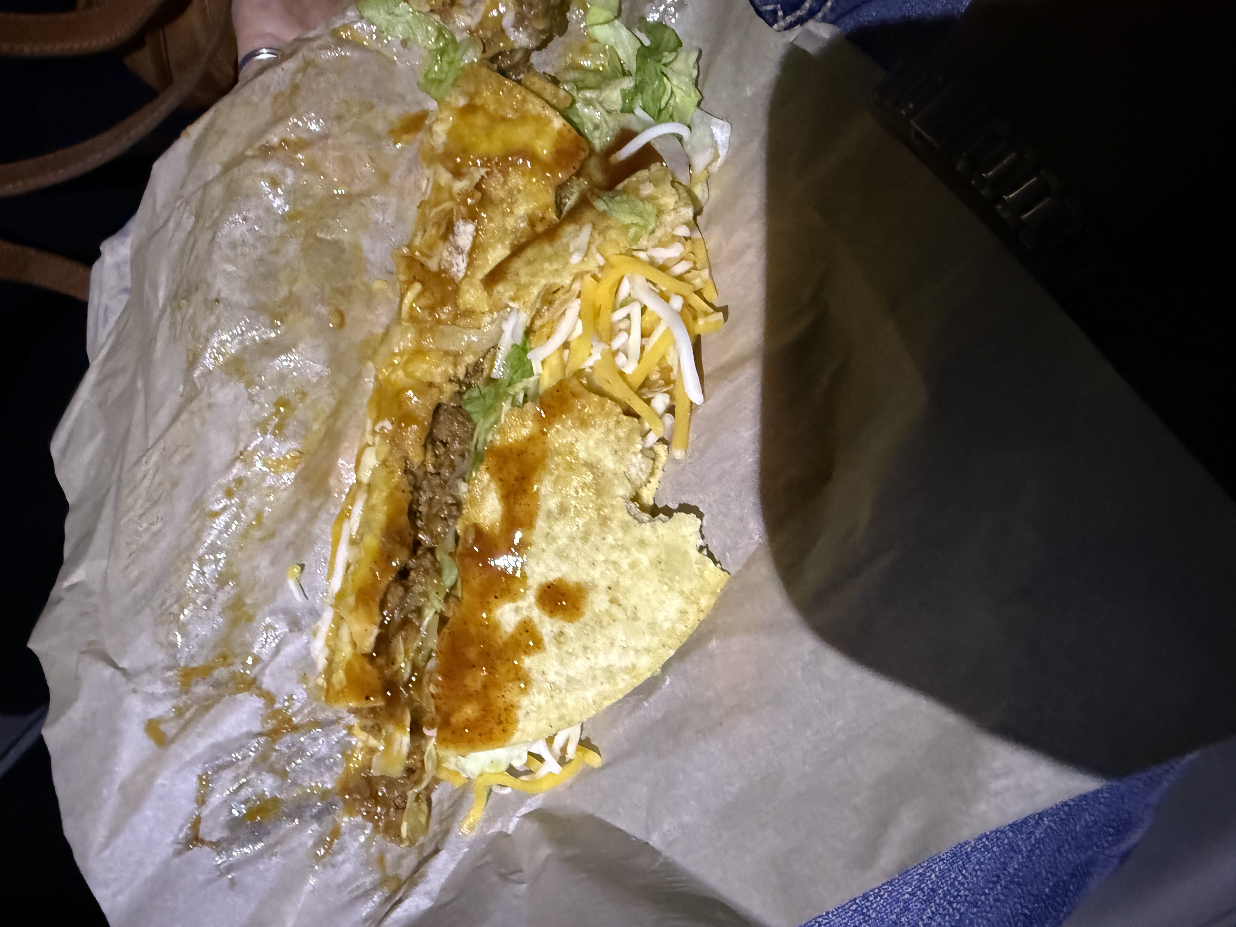 Stopping by Taco Bell late one night. Ordering tacos and all but one was crushed. Money well spent