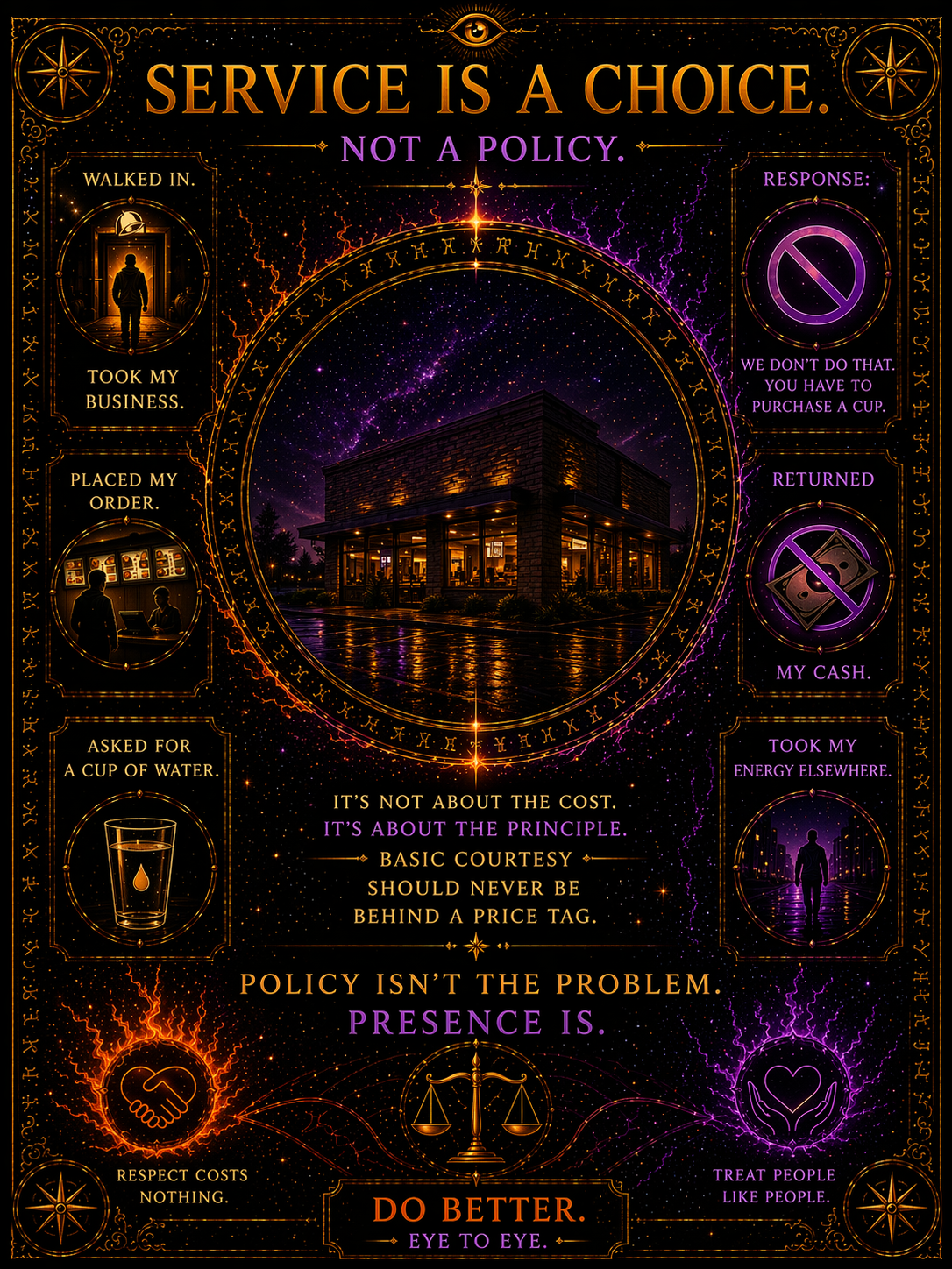 EYE TO EYE Walked in. Placed an order. Asked for a cup of water. Response: “You have to purchase a cup.” Returned the cash. This is not about the cost. It’s about the principle. Policy is one thing. Presence is another. Basic courtesy should not be behind a price tag. A public-facing space should carry both. Do better. — Eye to Eye