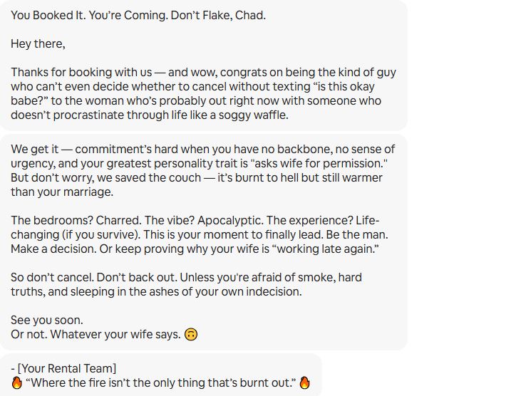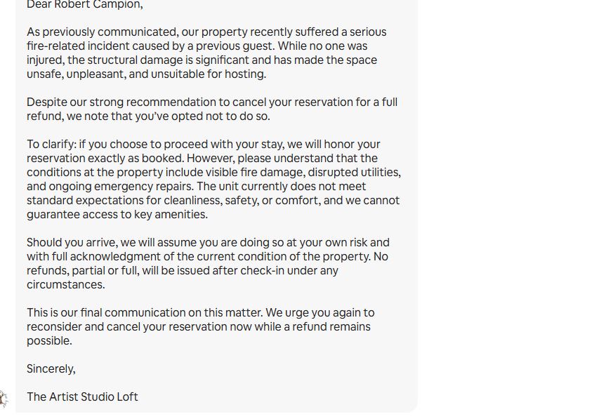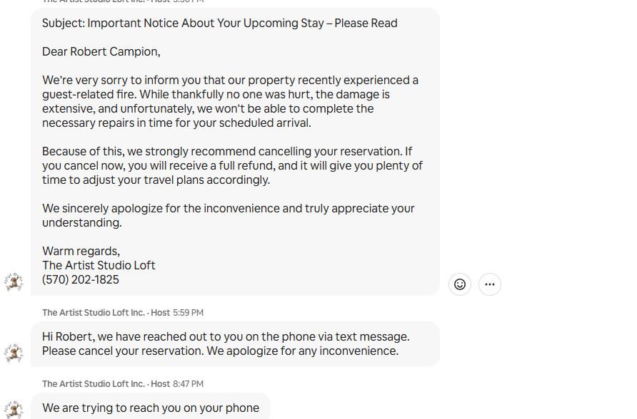 Artist's Loft Studio - Poconos A host with a perfect rating suffered a fire at the property. He became unhinged at me because I was busy and didn't cancel within a few hours. Now the world get's to see the type of person he is. I will be posting this everywhere and make sure everyone in his life sees it. I have petitioned Airbnb to permaban this host or risk losing my business which is substantial. $38k spent last year with my business.