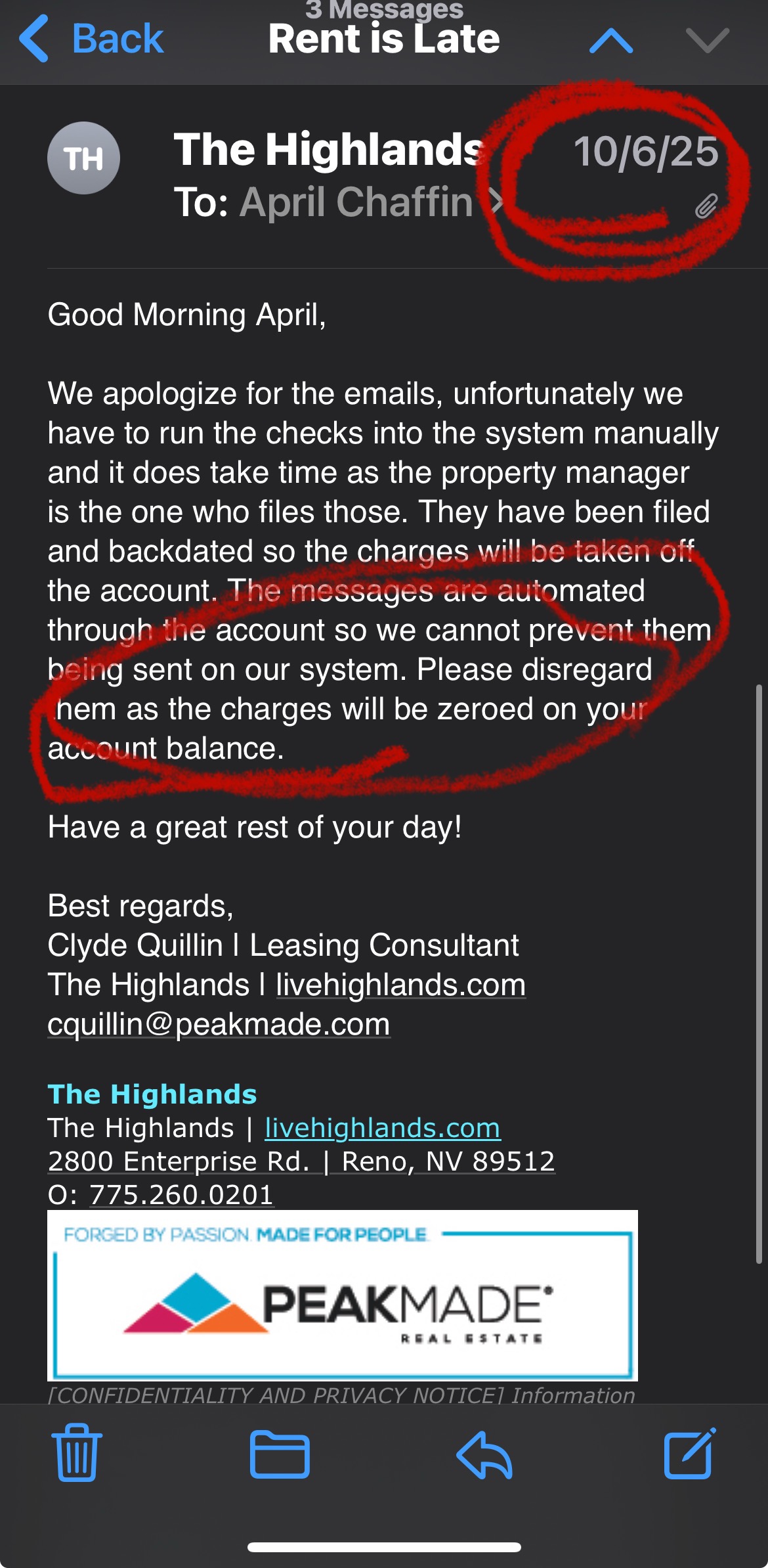 They deserve zero stars. I am a current resident. The past 4 months I have had issues with being harassed with texts and emails for 4-5 days AFTER I have paid with a money order. Last month, I snapped and told them they need to figure out their system and stop harassing me and my father for 5 days when I’ve paid. They emailed me back on October 6th apologizing and assuring me they removed the late fee. Today, they forced me to pay that very not deleted late fee. They would not take MY EMAIL as proof of this. I came in upset ... read more