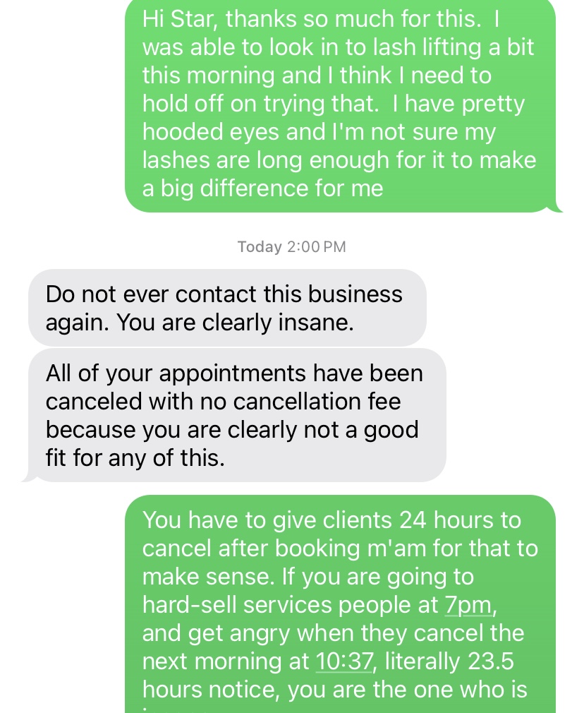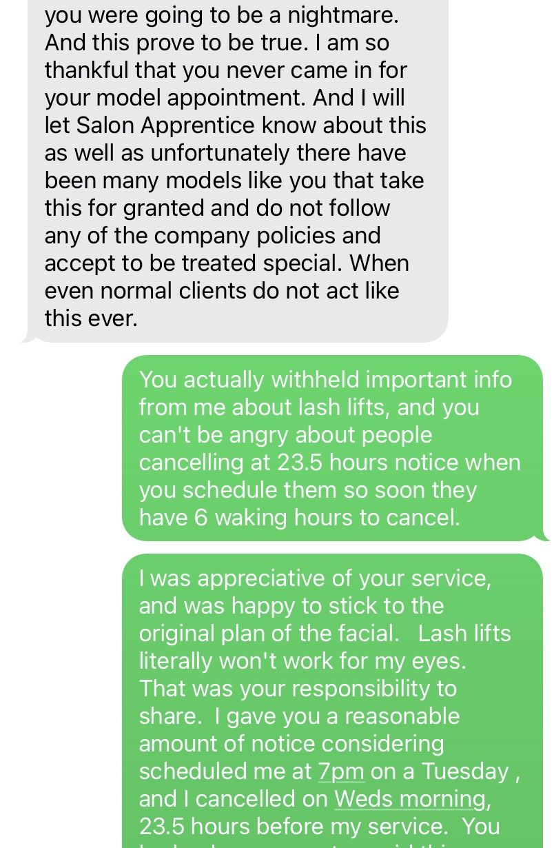I don’t know if the owner has some serious issues but this was the most horrible and hostile experience I have ever had with any salon owner or aesthetician. She reached out to me on a Monday evening at 7pm for a discounted facial service on Wednesday morning, in exchange to film for social media promotion, and a 5-star review. After a long call going over details, she offhandedly mentioned she was also running a promo for lash lifts and did a bit of sales pitch, so I said sure, I’d try that too. She didn’t tell me anythin... read more