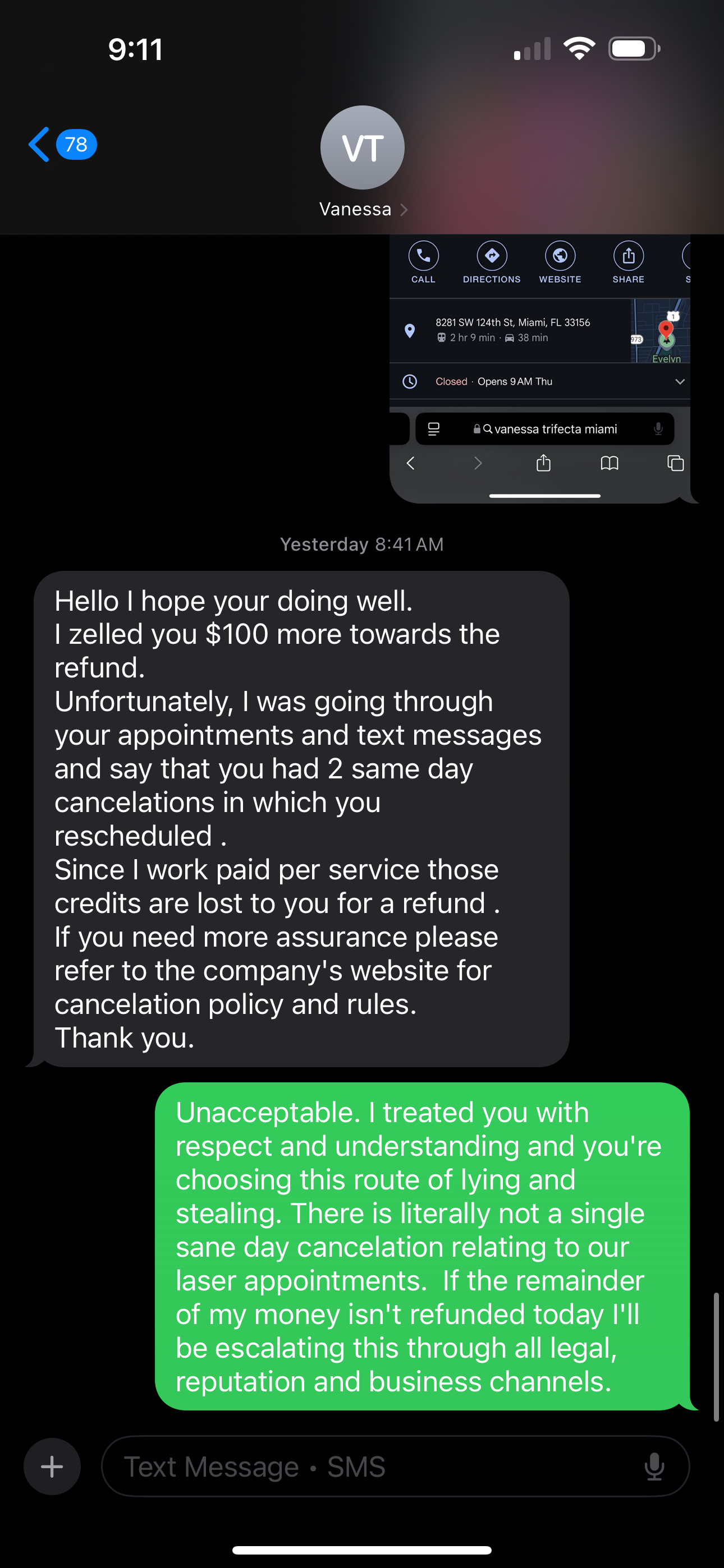 I am filing this complaint against Vanessa Falcon, who represented herself as a provider of laser services at Trifecta Miami Spa (8281 SW 124th St, Miami, FL 33156). I paid in advance for multiple sessions, but services were not rendered in full, and I have not received the refund I am owed. Despite my repeated, respectful requests, Vanessa has delayed repayment using inconsistent and unprofessional excuses, including personal financial issues and a lawsuit that does not involve me. She initially promised a refund within 30... read more