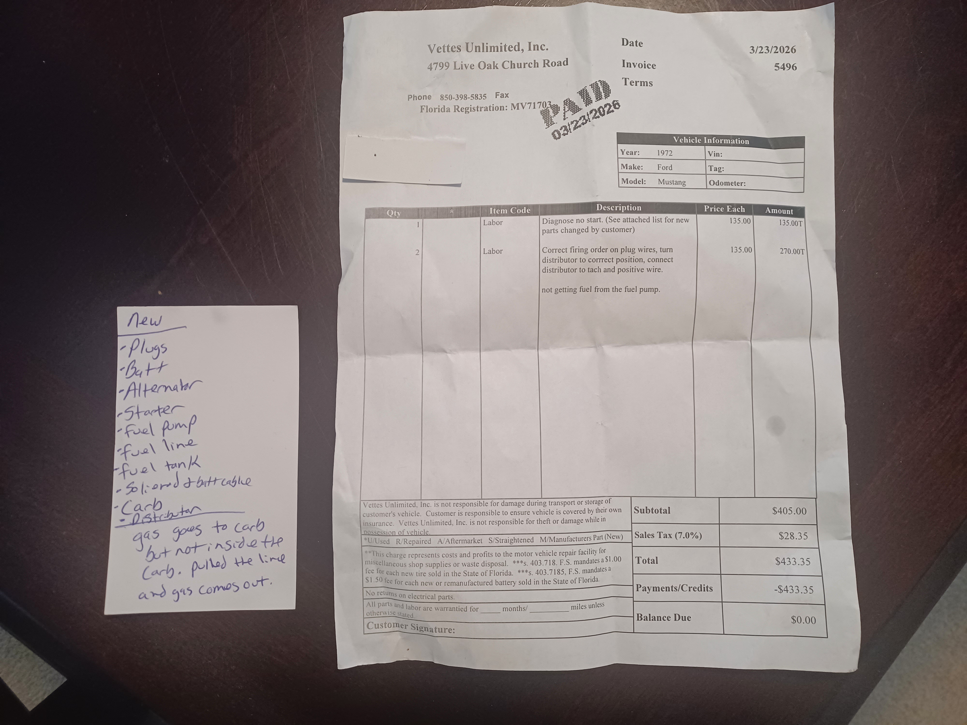 This repair shop was the worst I've encountered ever taking my vehicle to a repair shop and I've traveled around the world for over 21 years (Retired Air Force) for repairs for my vehicles. The secretary and mechanics were very friendly and knowledgeable, unlike the owner scott who was very unprofessional and rude! I dropped my 1972 Ford Mustang convertible off to be diagnosed and possibly repaired due to would not start. I provided a list of all of the new parts replaced and information regarding no fuel entering the carbur... read more