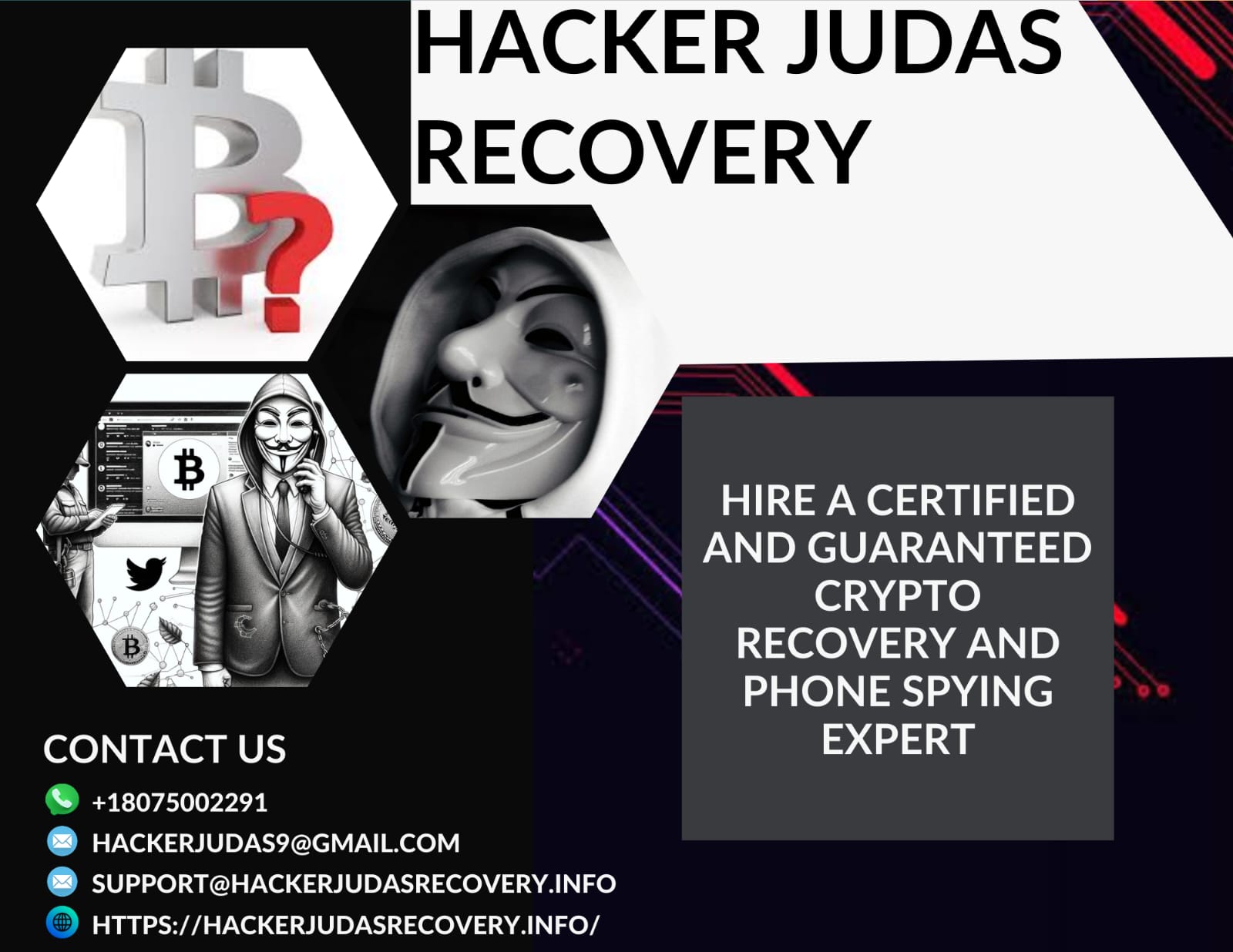 HACKER JUDAS HELPED ME RECOVER ALL MY BITCOIN BACK I was so sad and pained after all my goods worth of millions was stolen, I couldn’t traced it neither could I find who stole it but when I came across Hacker Judas everything changed, they help me to recover all my stolen goods without difficulties, it was the best moment of my life, and I want to appreciate, and show my gratitude to Hacker Judas for helping me out. try them on Whatsapp: +18075002291 E mail: hackerjudas9 @ g mail . com
